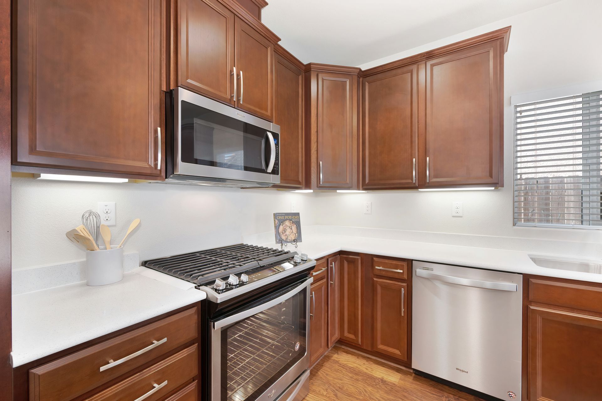 Here, you’ll find an expansive island with counter seating, stylish pendant lighting, rich soft-close cabinetry with decorative hardware and roll-outs, under cabinet lighting, stainless steel appliances, and a generous walk-in pantry.