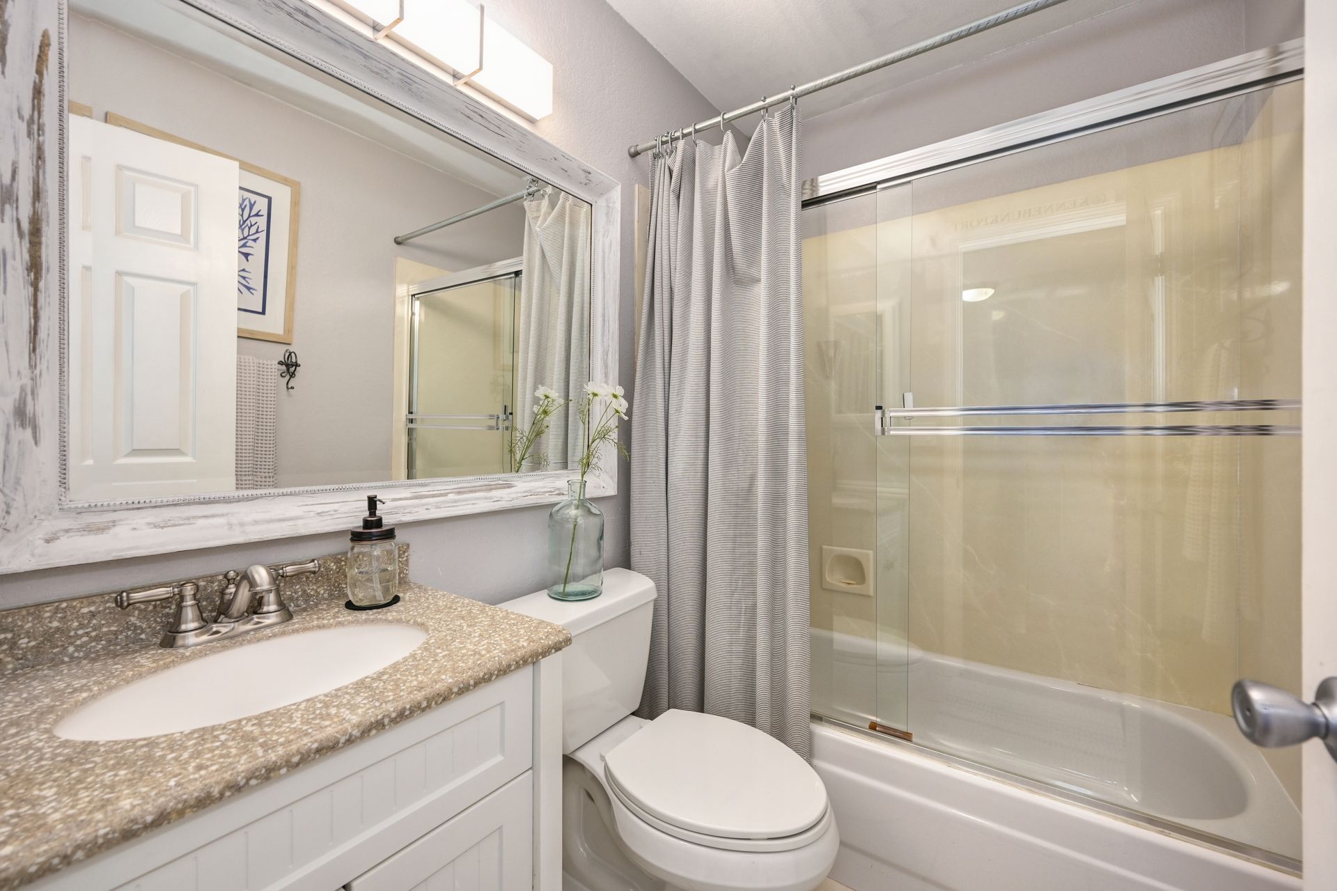 Secondary bathroom features an updated vanity, updated lighting, framed mirror, and a tub/shower combo with a glass door.