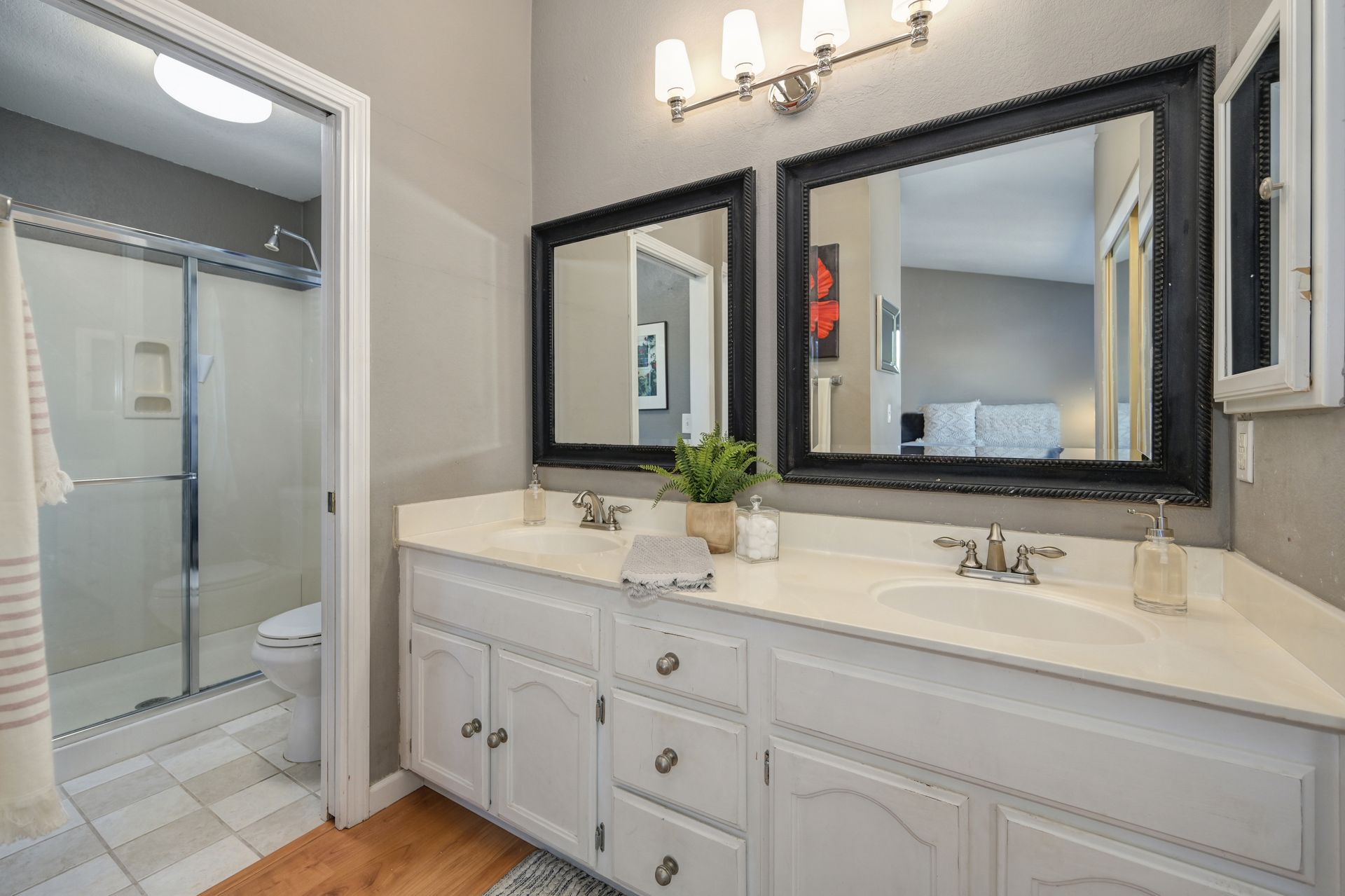 Primary bathroom features a dual sink vanity, framed mirrors, updated lighting, and a shower with a glass door.