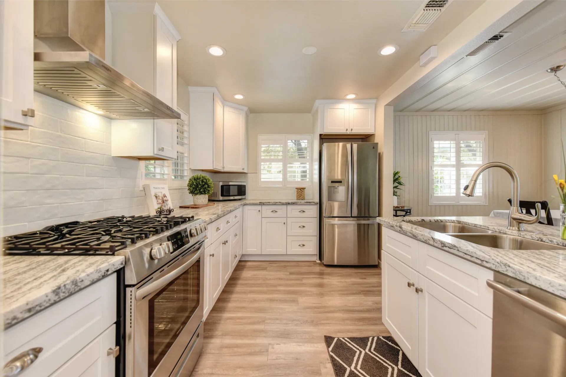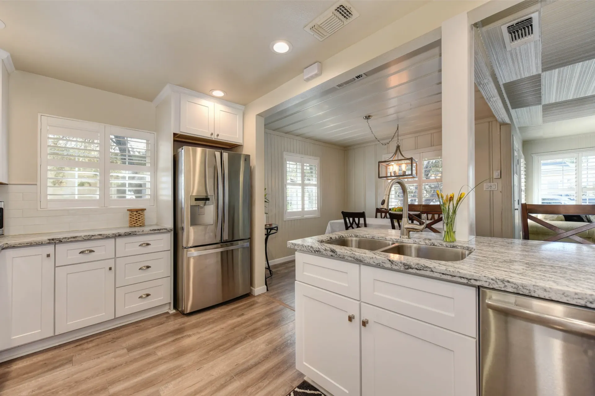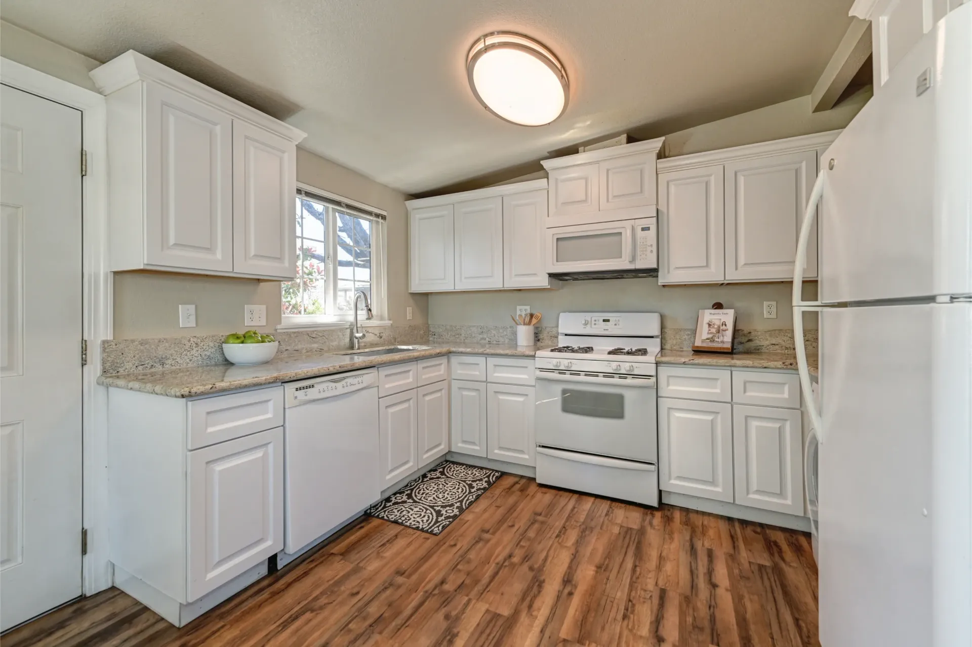 This home has been fully updated inside. It features hardwood laminate flooring, a gathering room, a kitchen with white cabinetry and granite counters, a full bathroom with glass enclosed shower, a bedroom, space for a washer/dryer combo, and a spacious fenced in backyard with a meyer lemon tree and RV access.