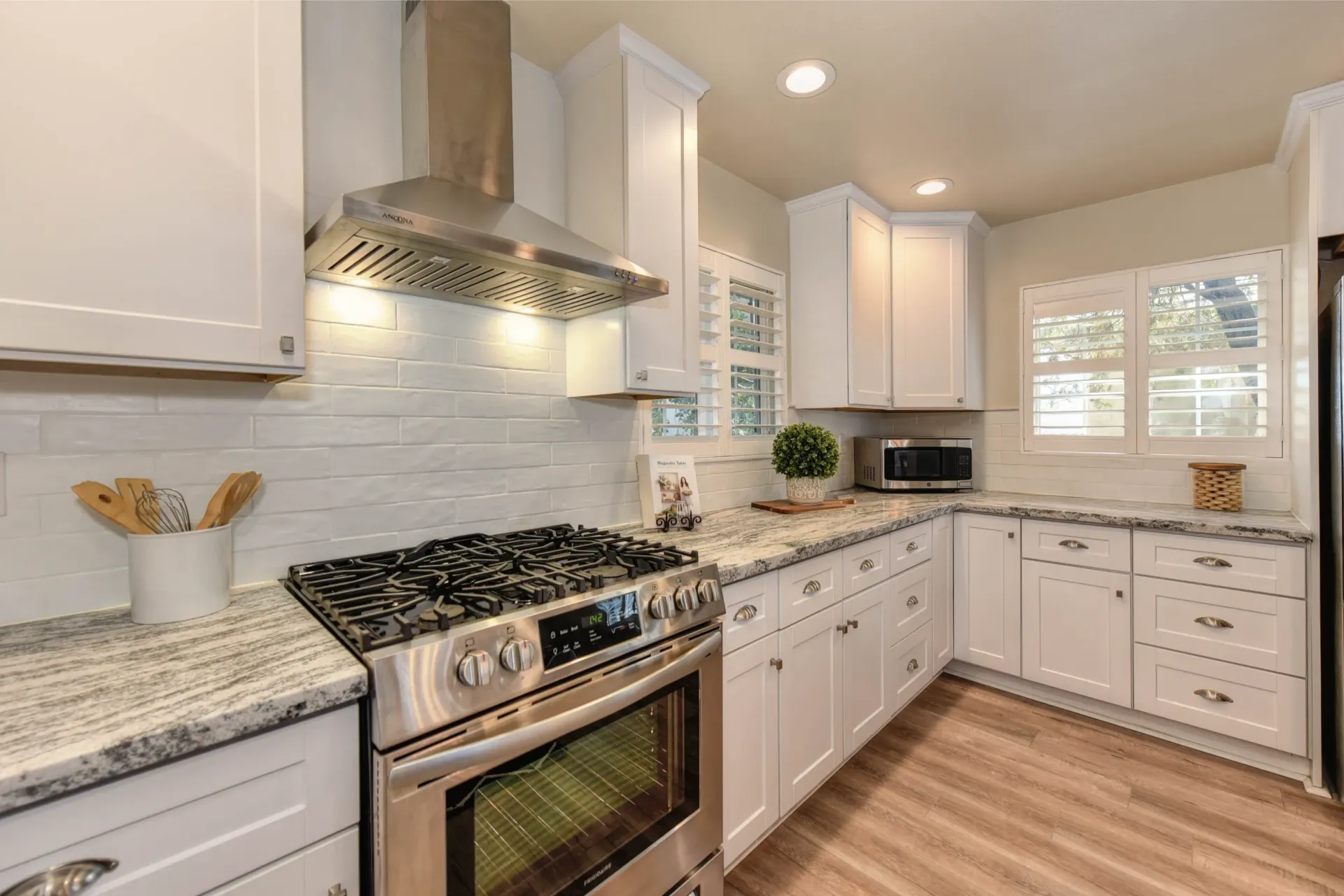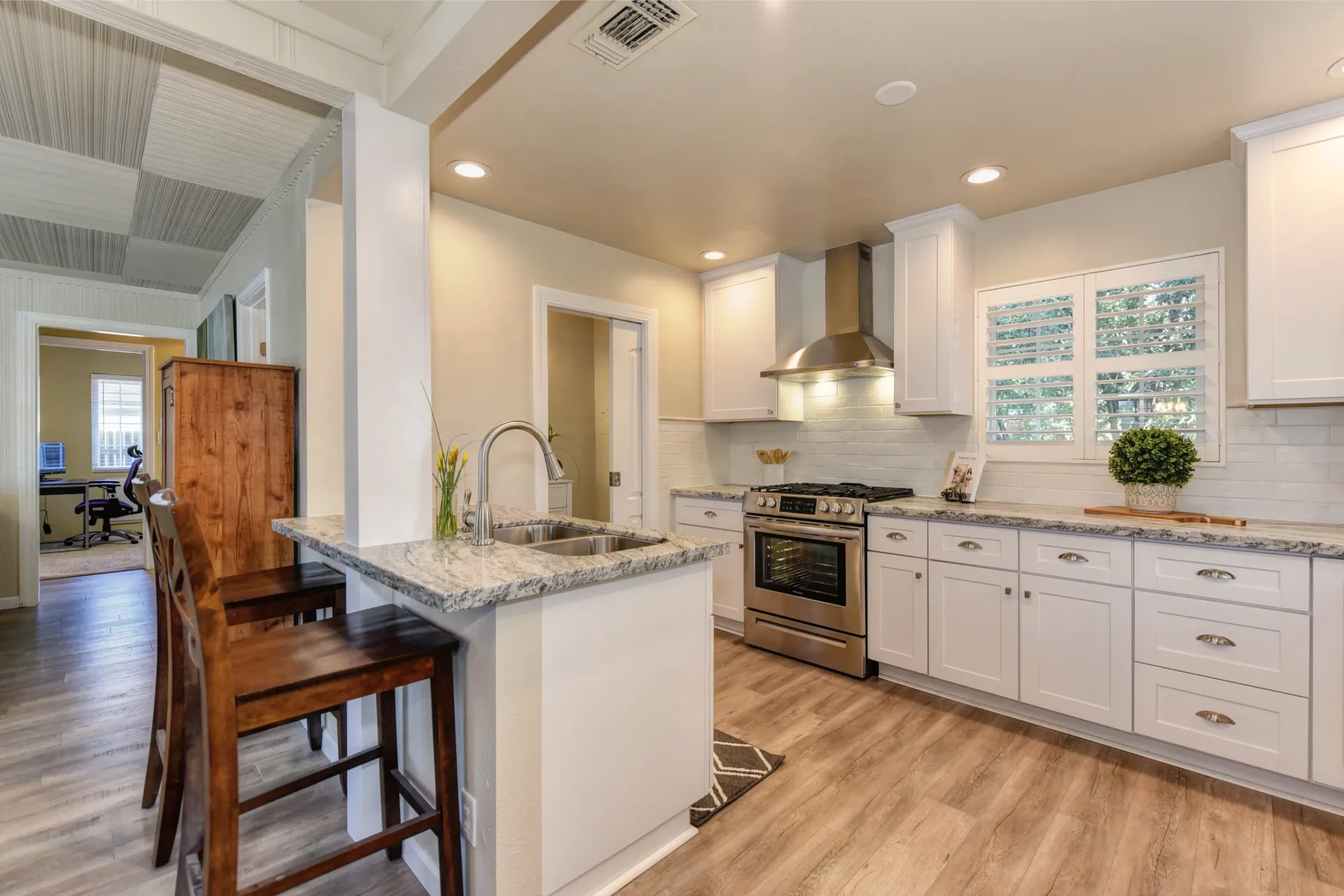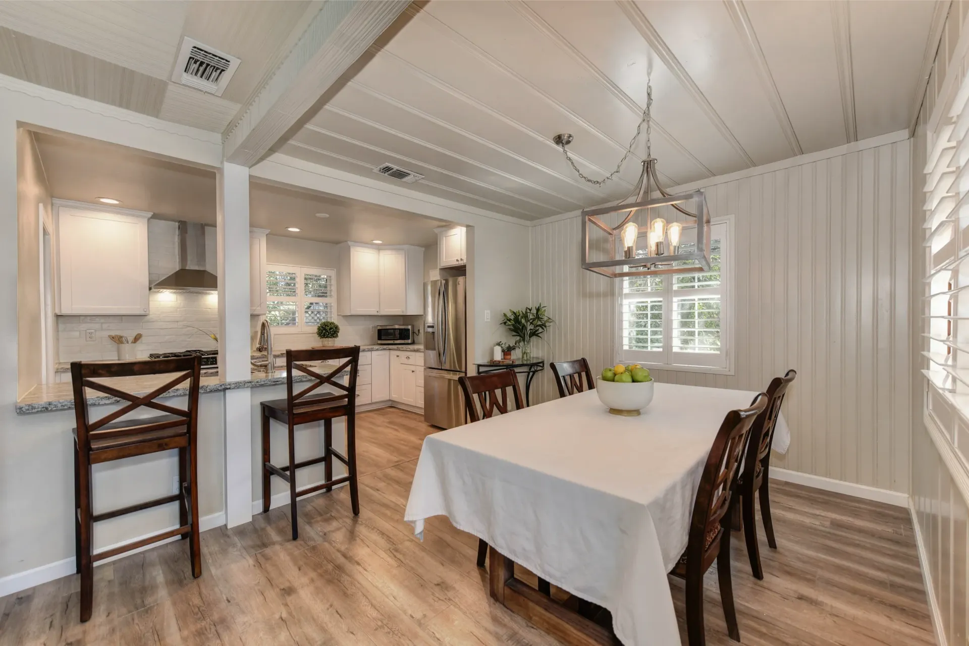 This home has been fully updated inside. It features hardwood laminate flooring, a gathering room, a kitchen with white cabinetry and granite counters, a full bathroom with glass enclosed shower, a bedroom, space for a washer/dryer combo, and a spacious fenced in backyard with a meyer lemon tree and RV access.