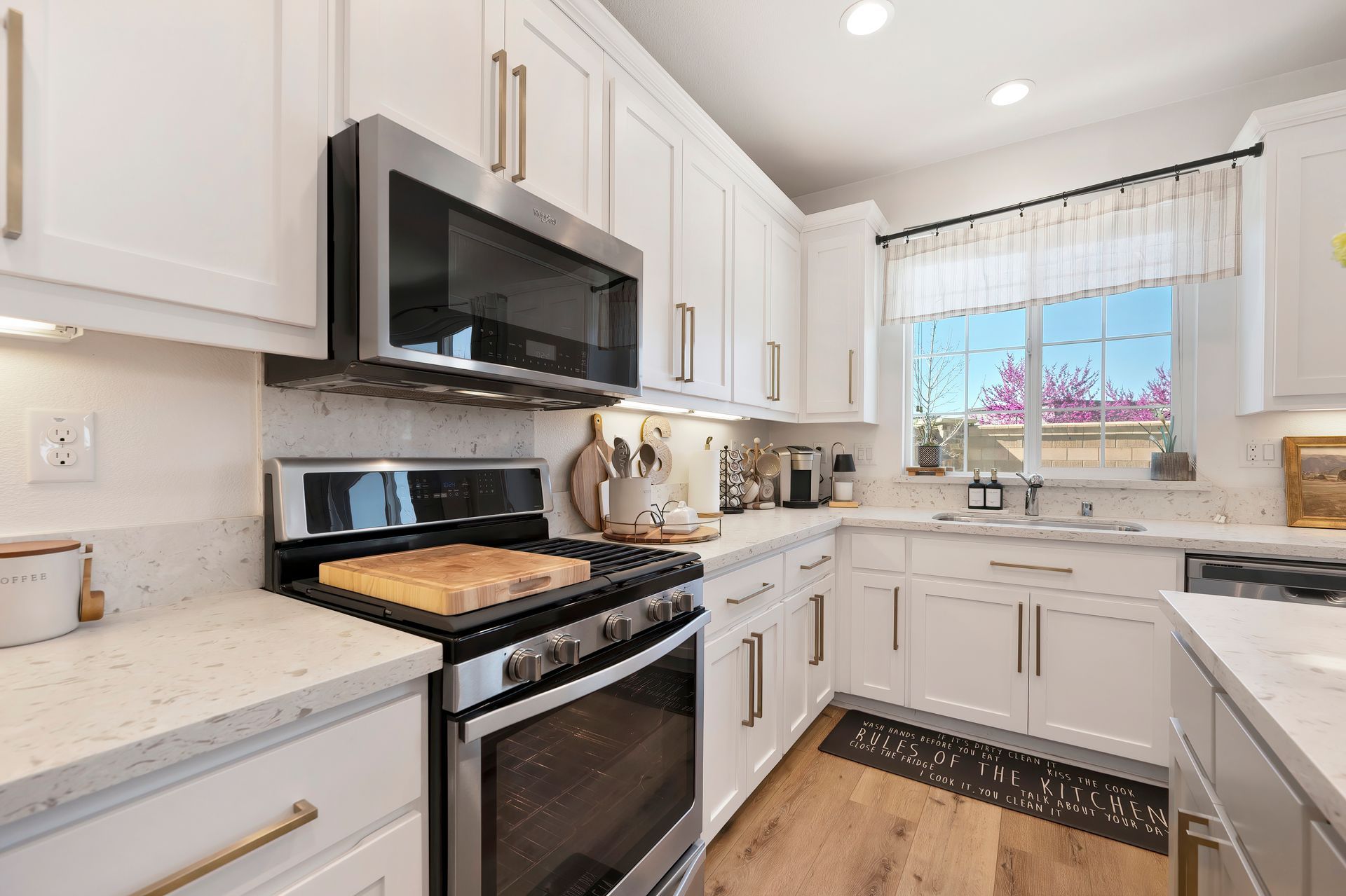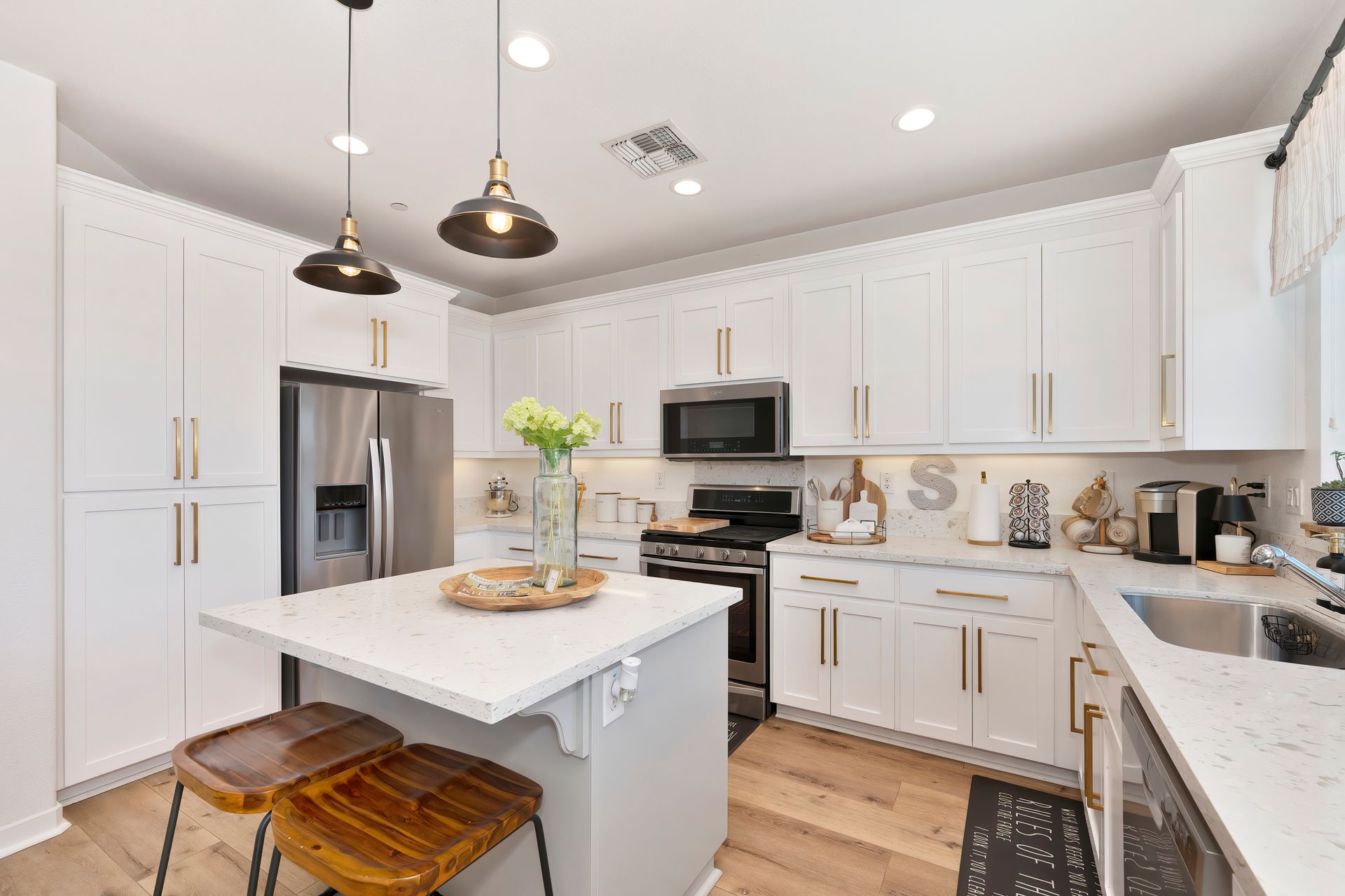 Kitchen features an island with counter seating, pendant lighting, quartz countertops, ample white cabinetry with beautiful decorative hardware and roll-outs, under cabinet lighting, and stainless steel appliances.