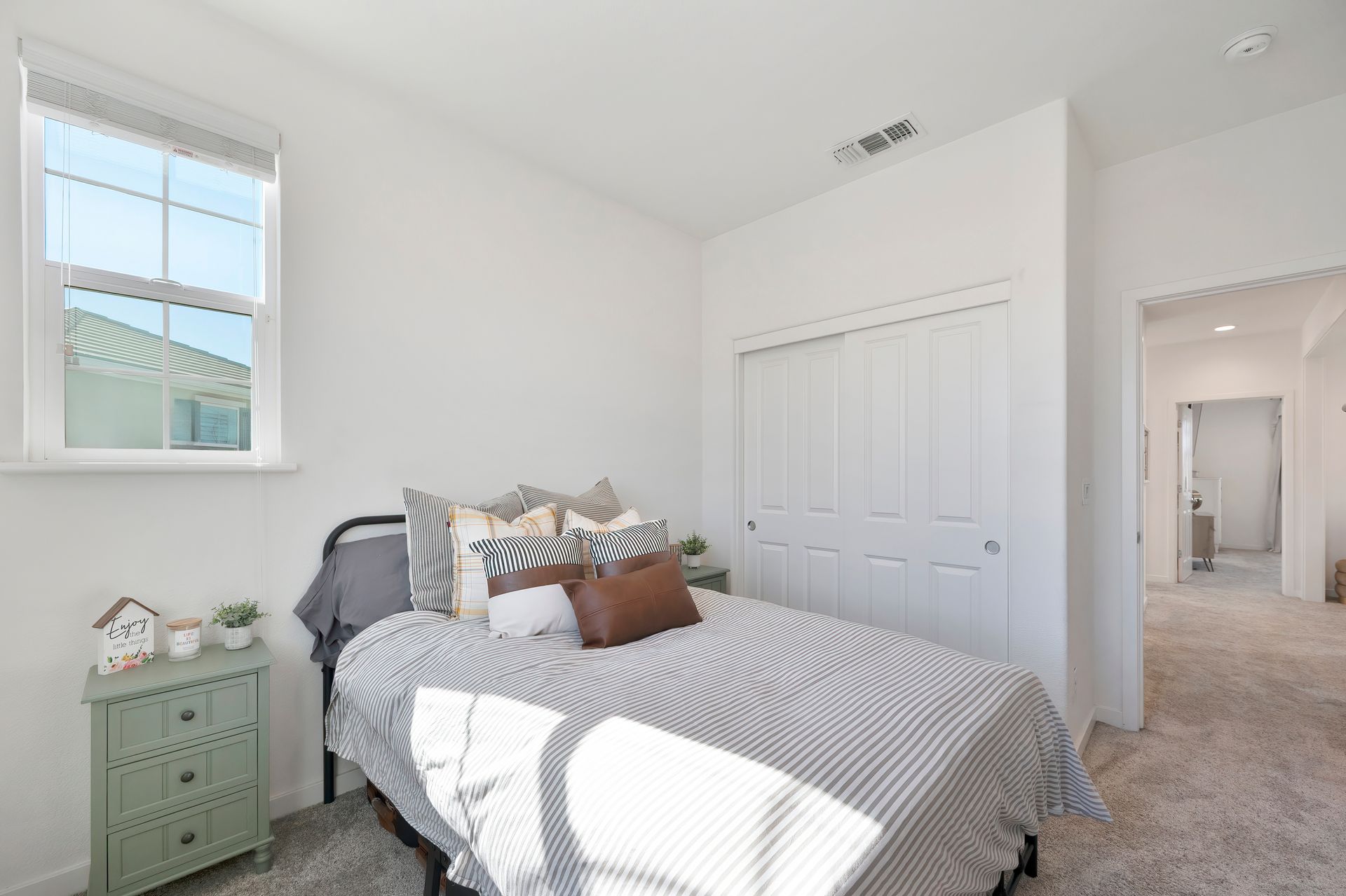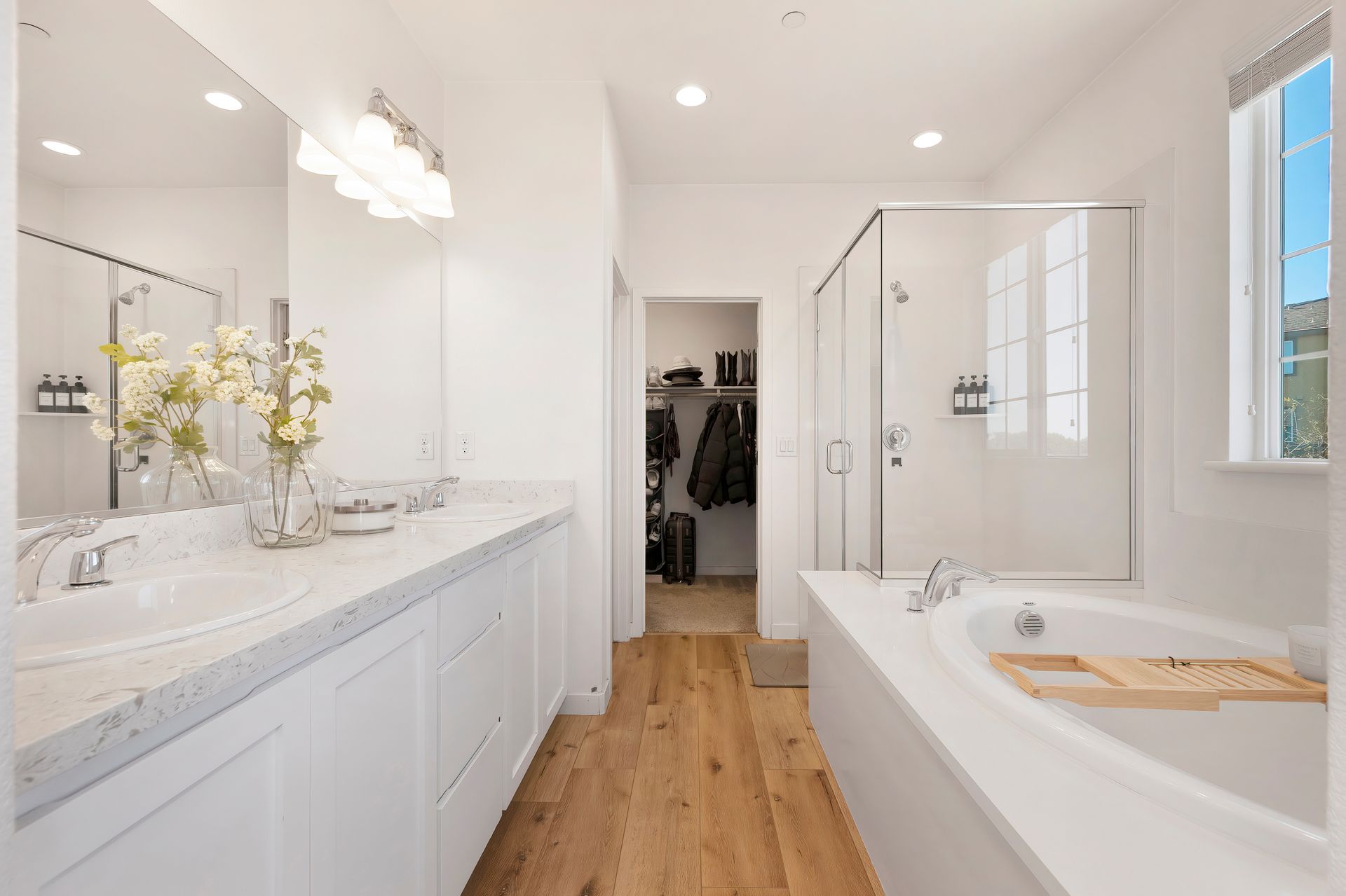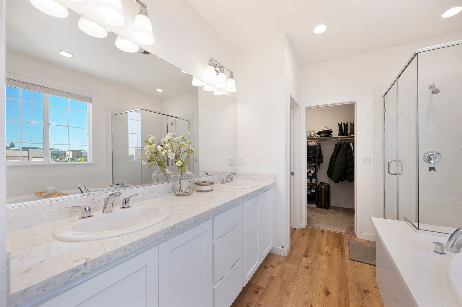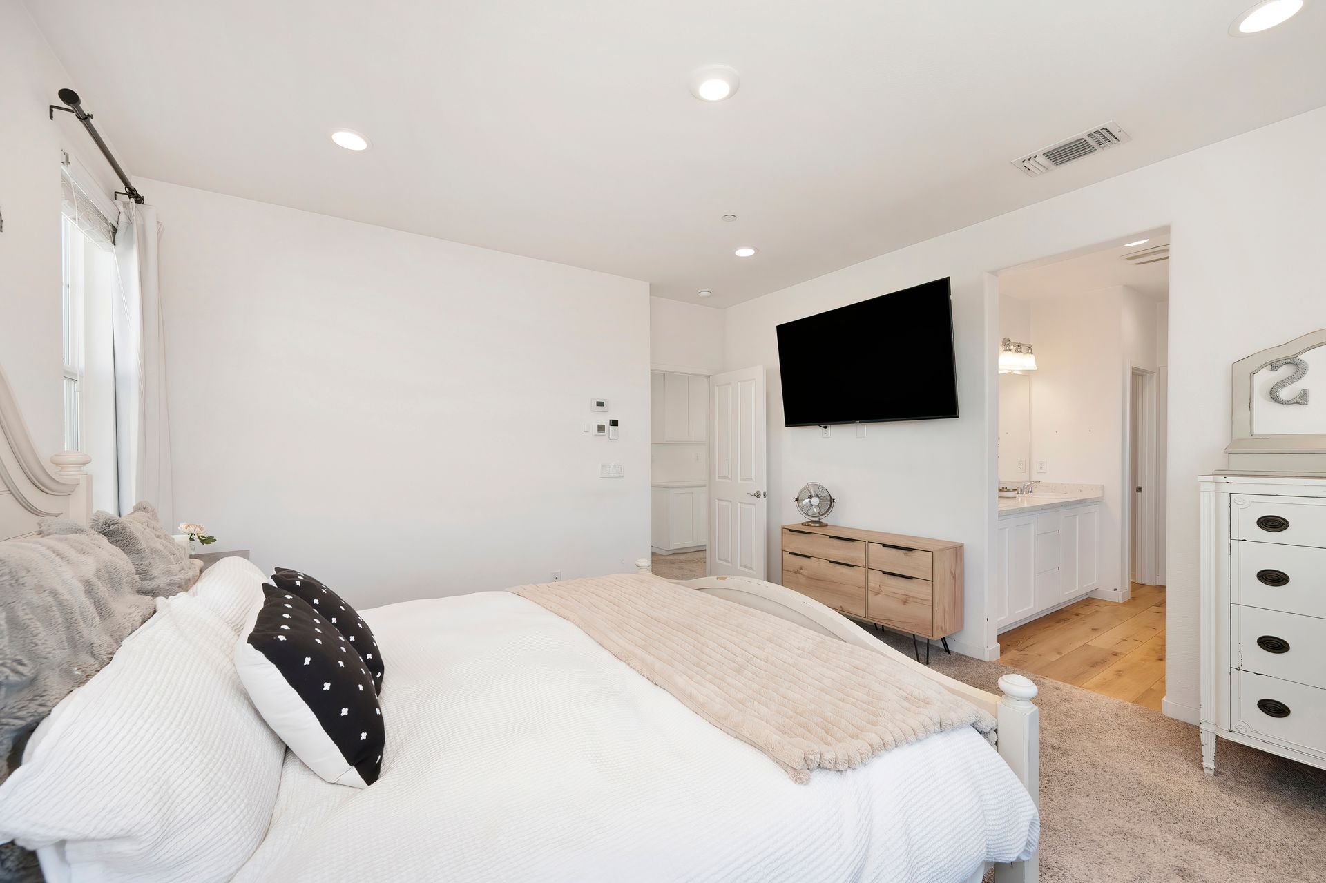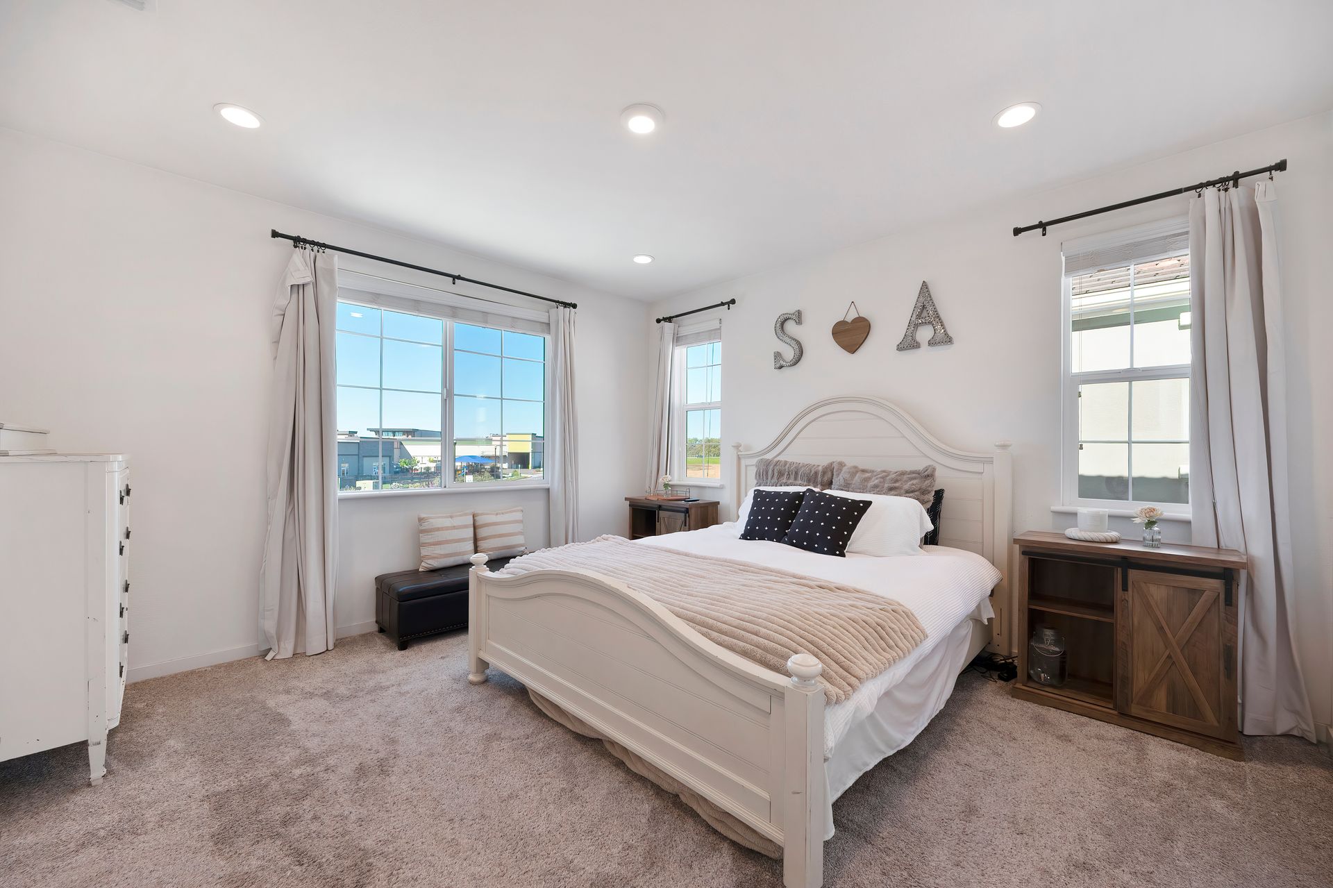 Spacious primary suite with abundant natural light and a large walk-in closet with shelving.