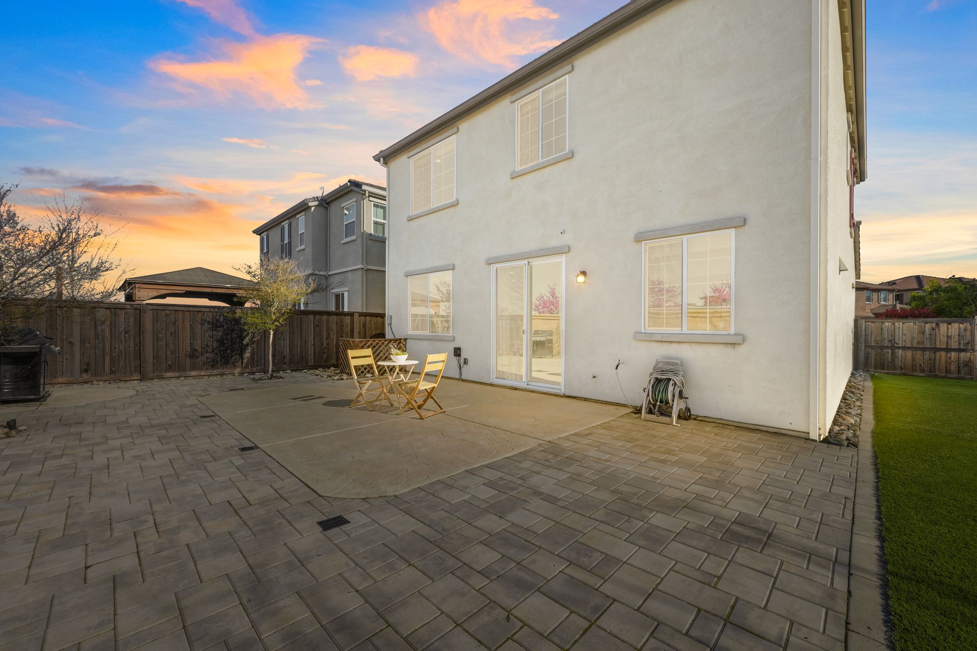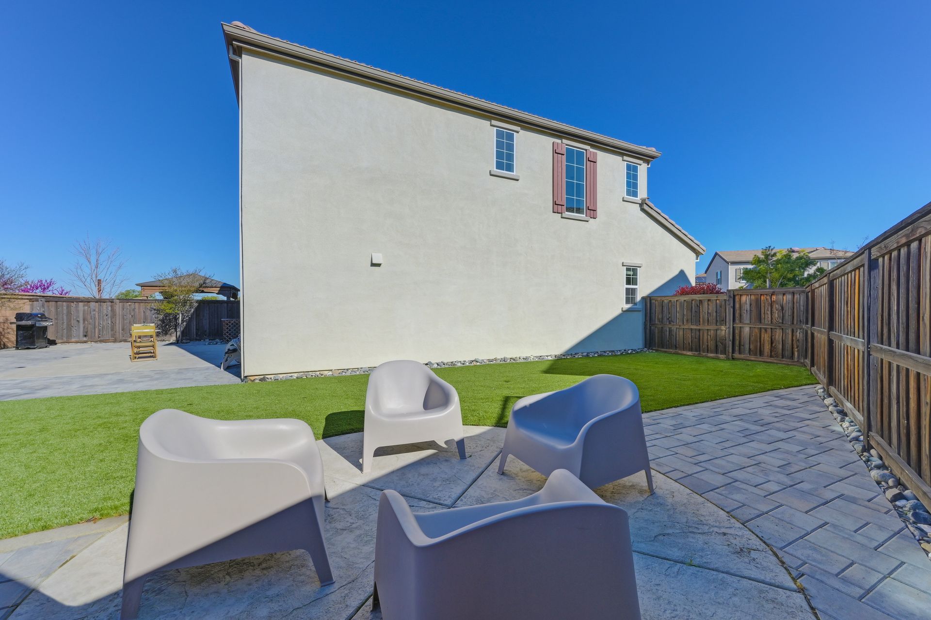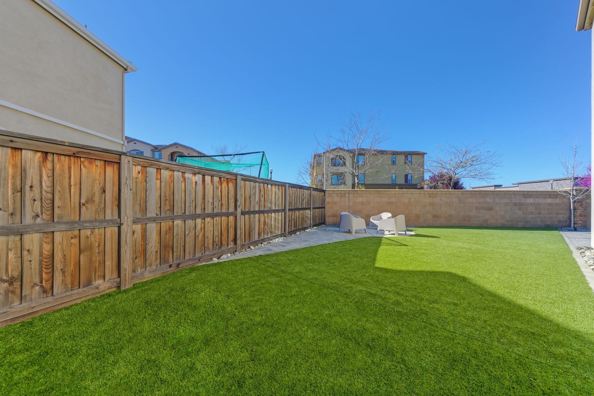 Large, landscaped backyard with stamped concrete, pavers, artificial grass, and multiple areas for entertaining.