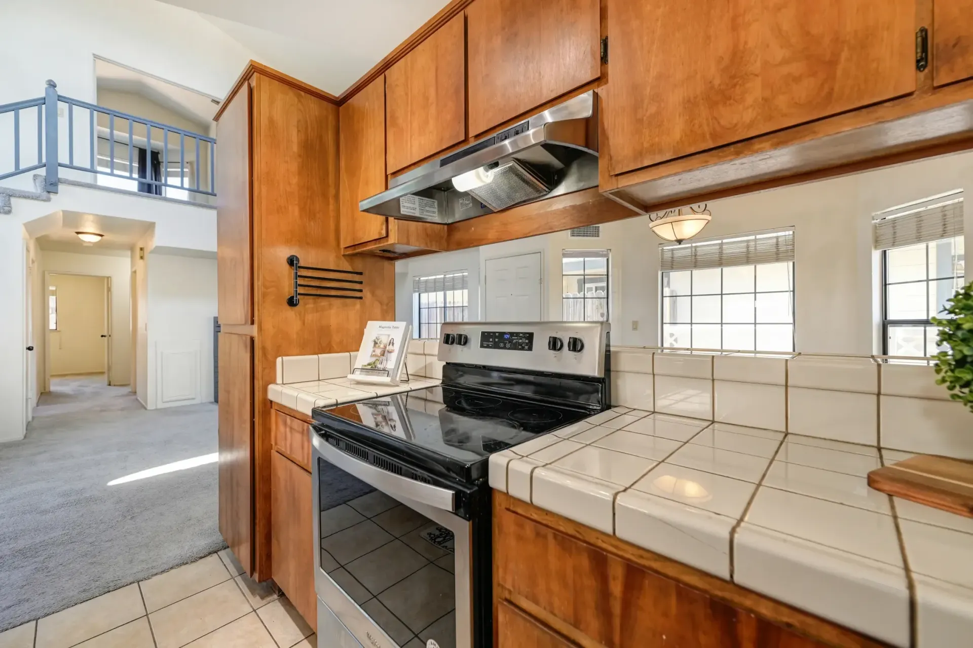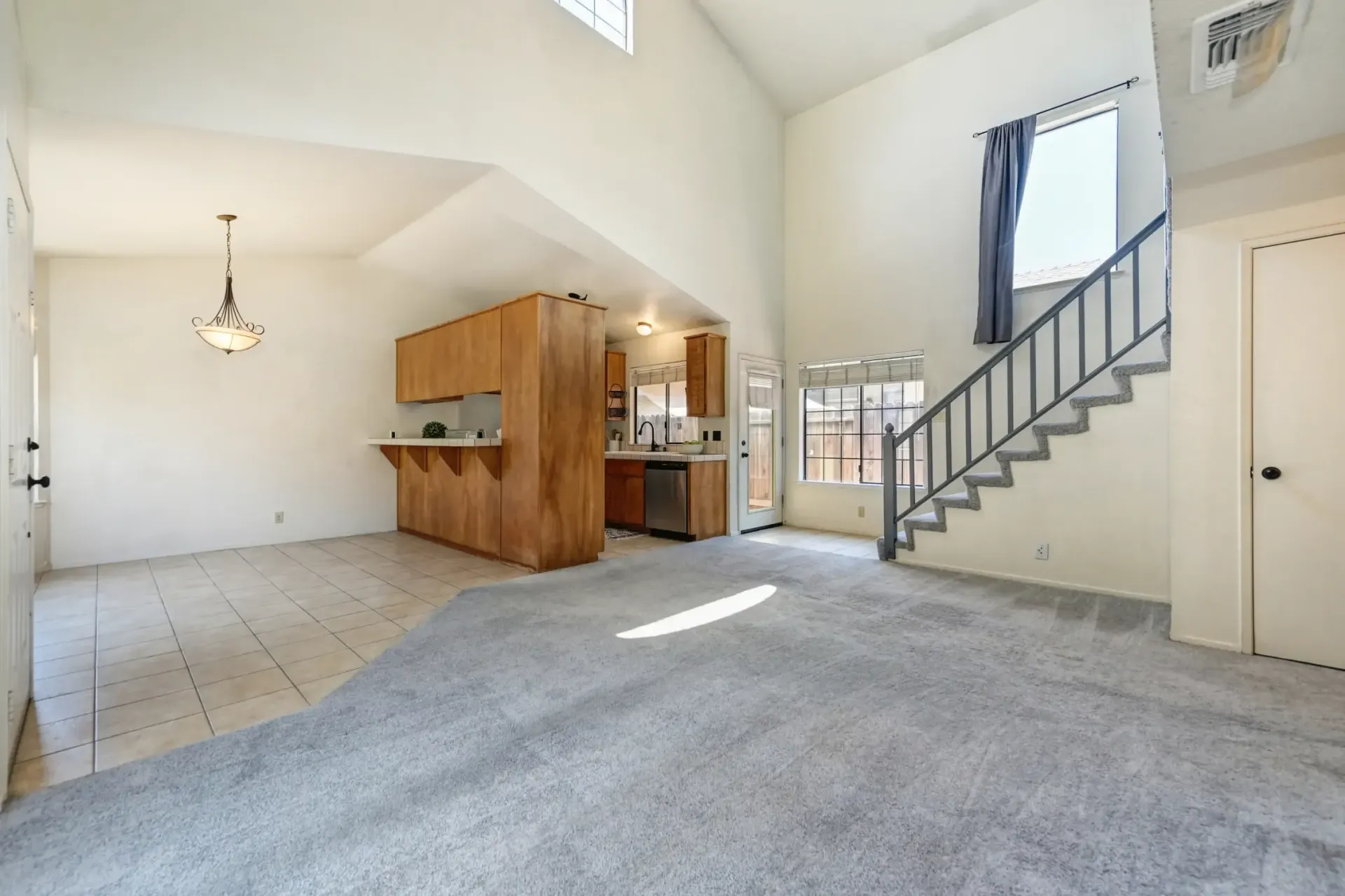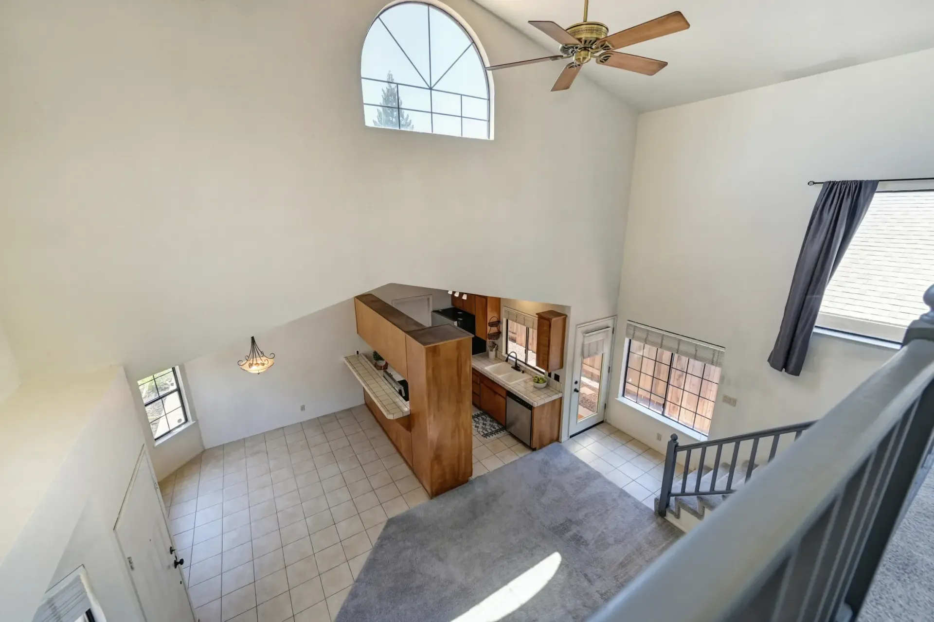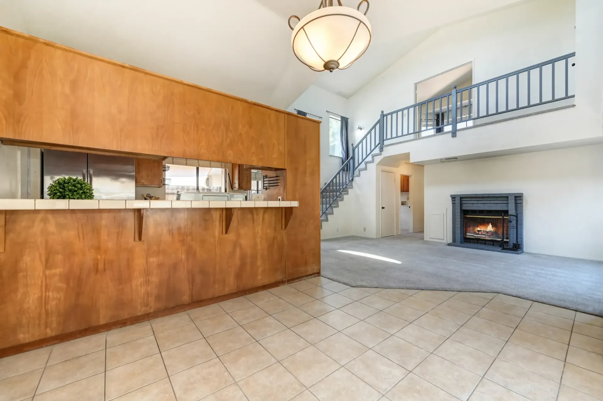 Open rail staircase leads to a private and spacious primary suite with double doors, a vaulted ceiling, and large closet.