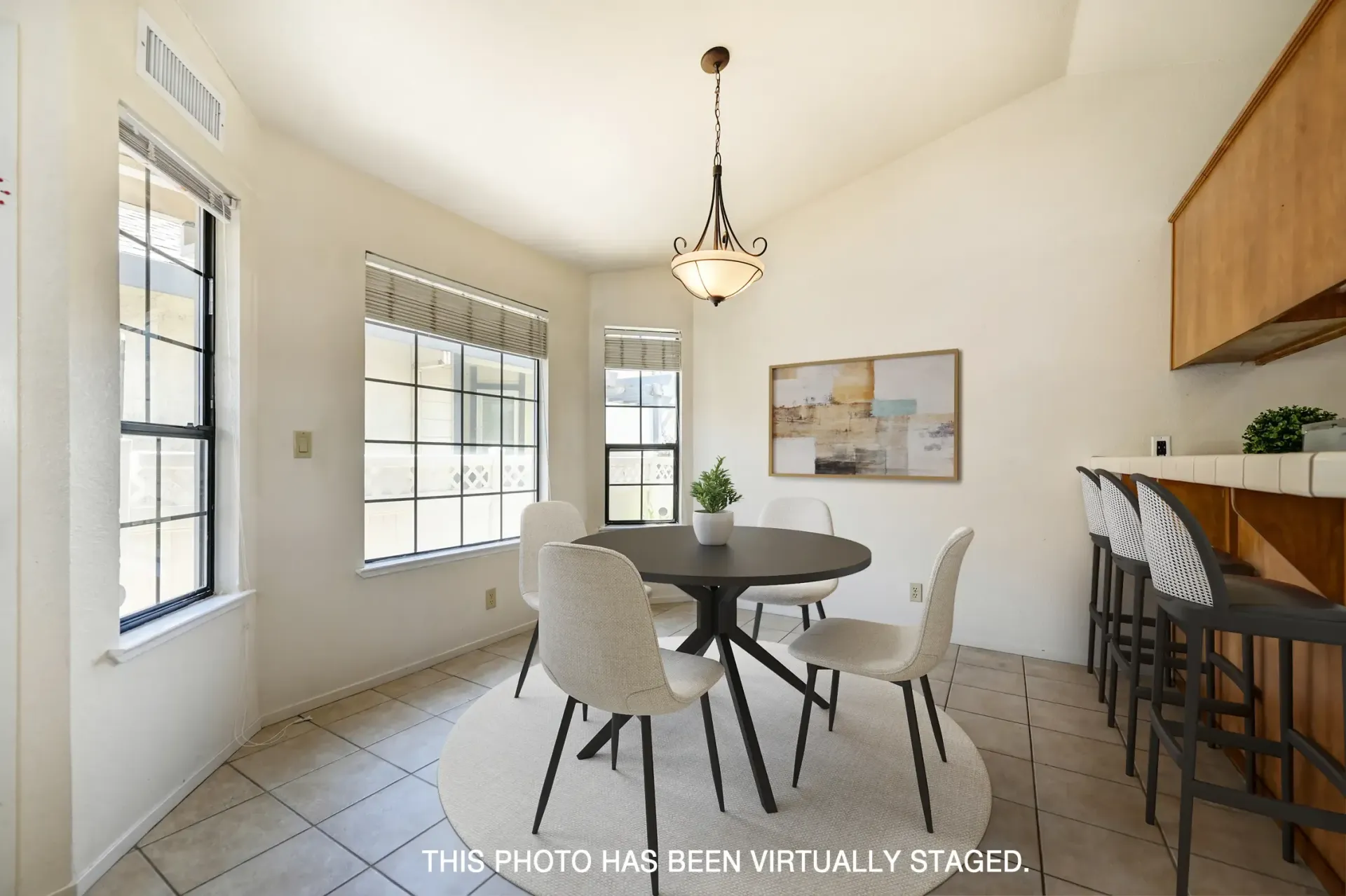 Breakfast nook with a chandelier and bay window.
