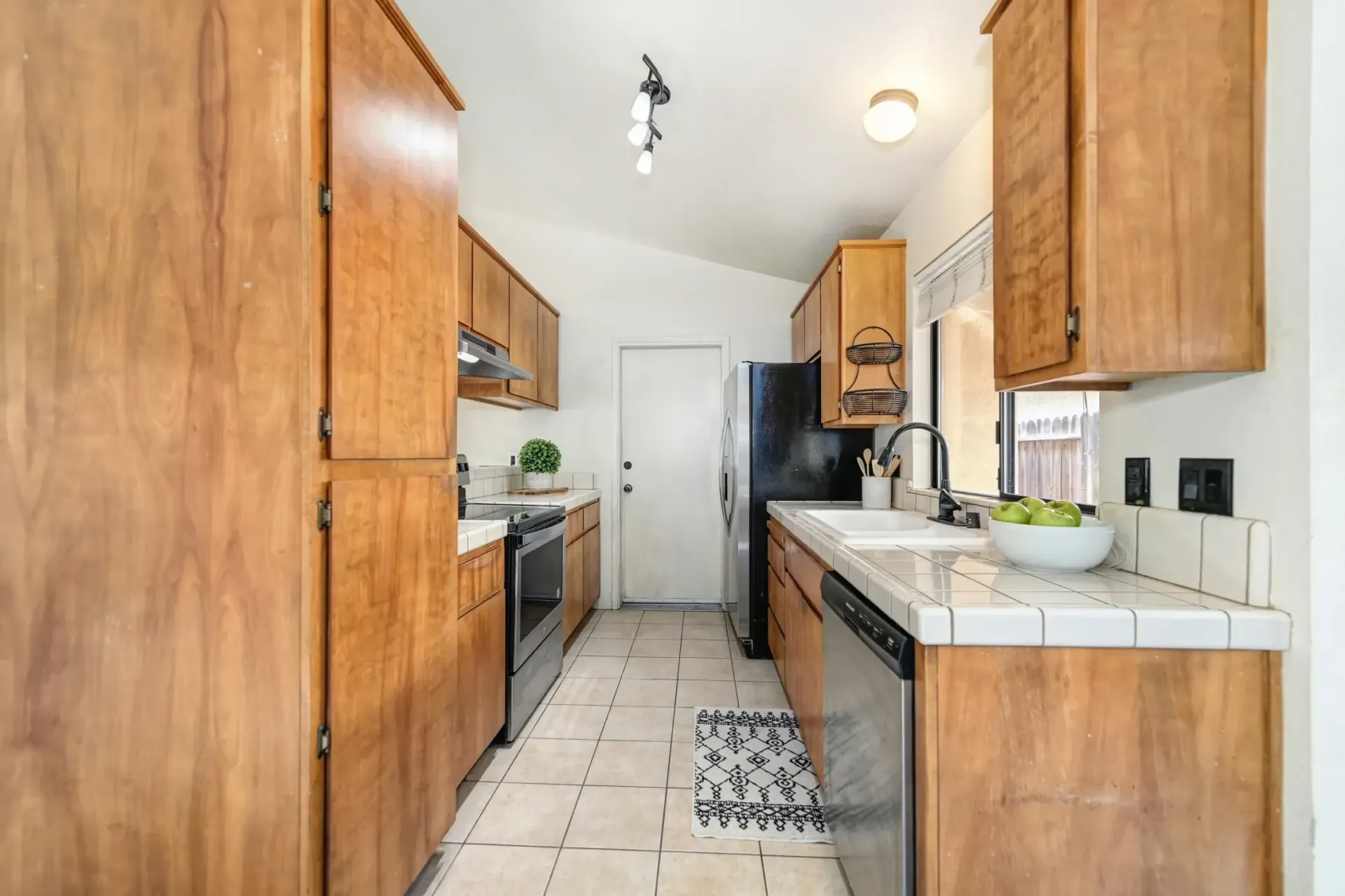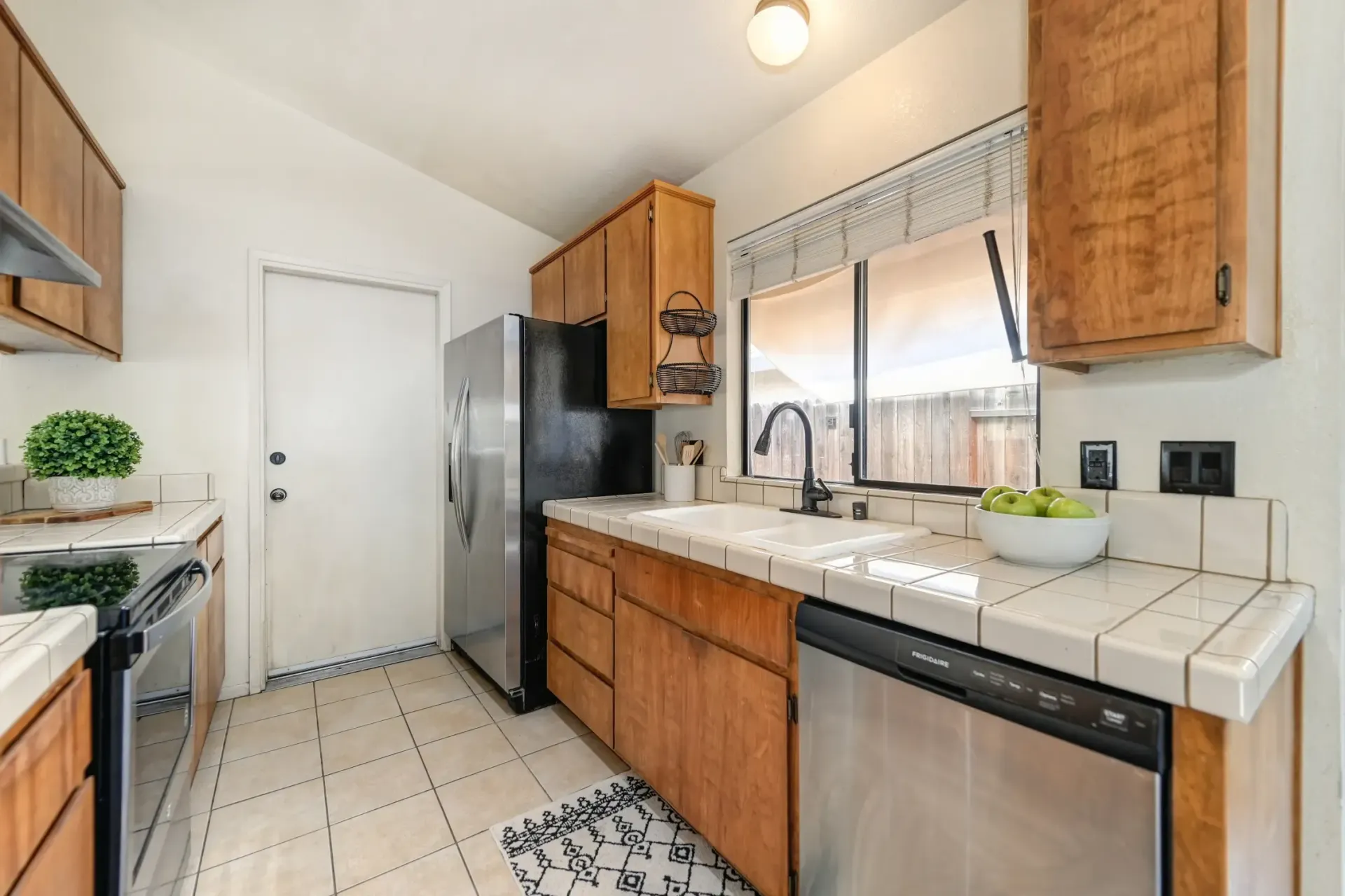 Kitchen with stainless steel appliances, updated faucet, and counter seating.