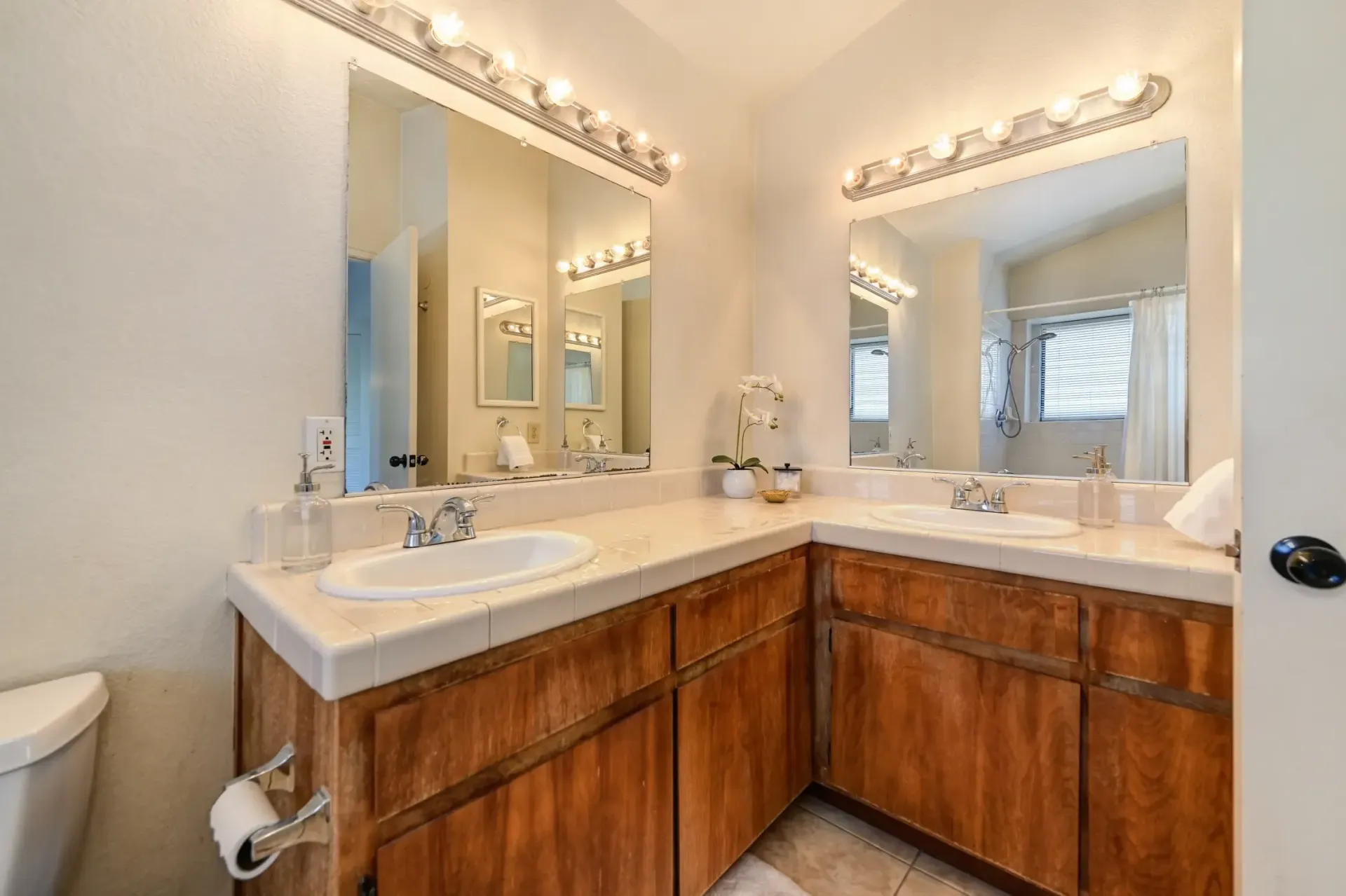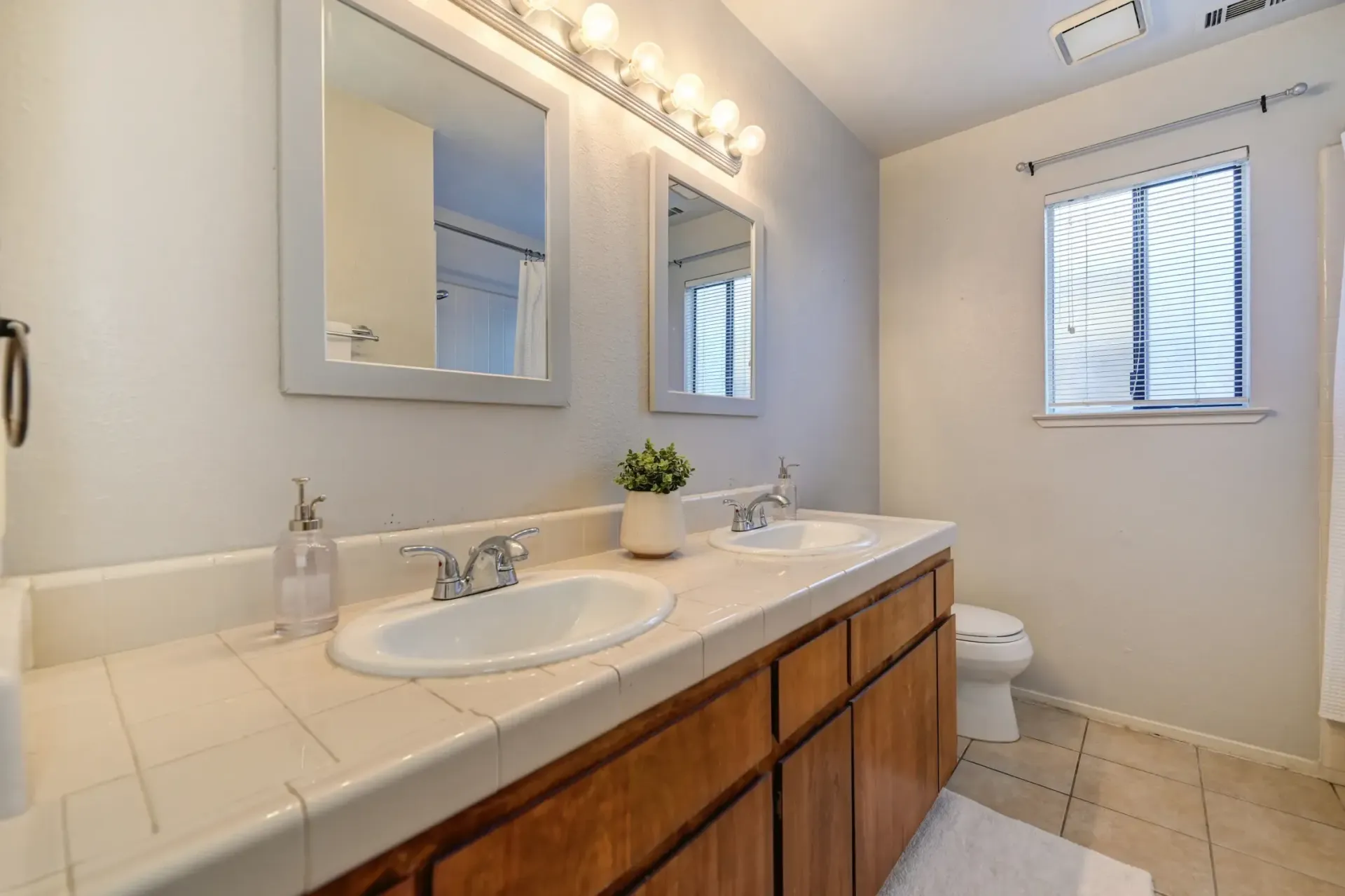 Secondary bathroom with a dual sink vanity, framed mirrors, and tub/shower combo.