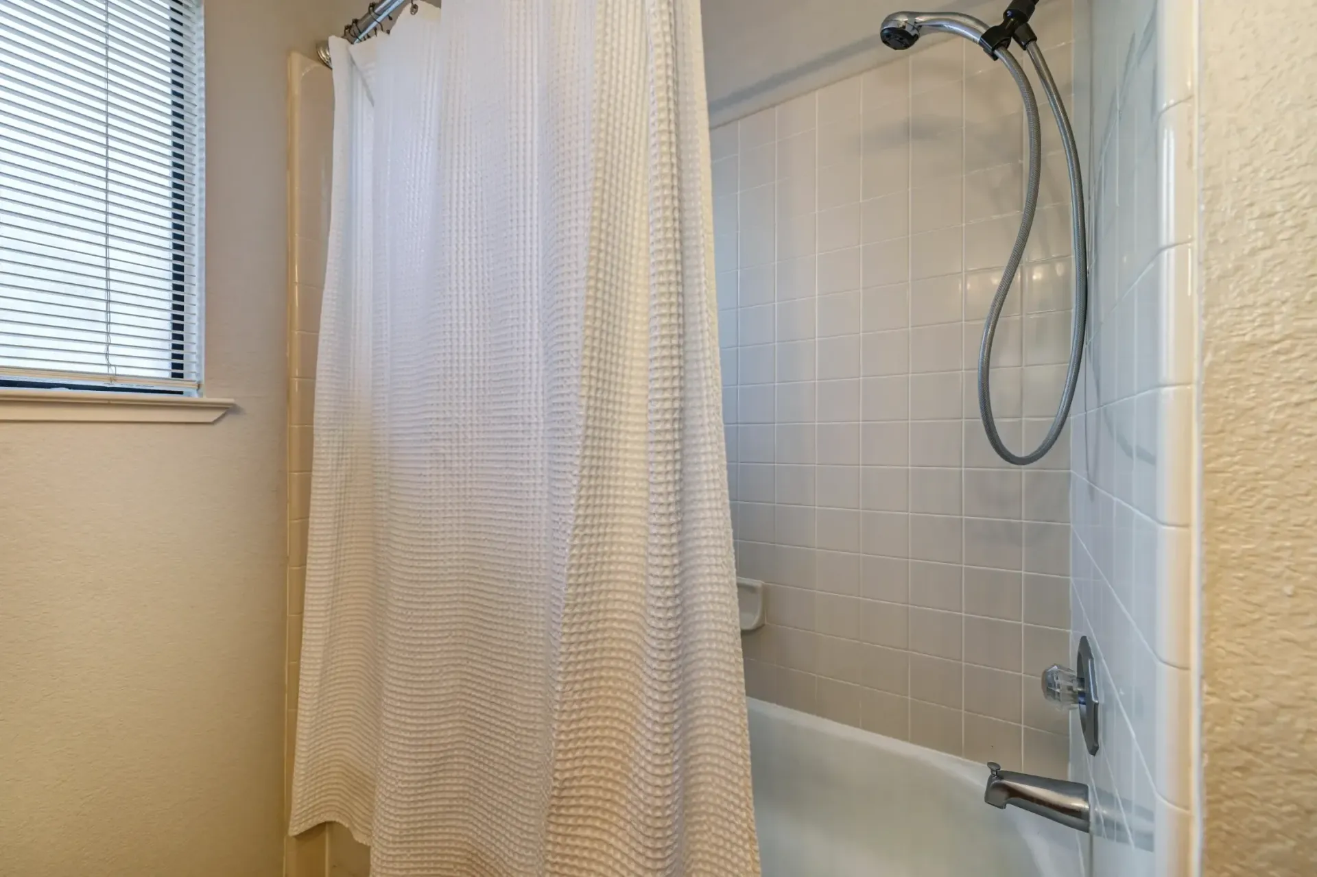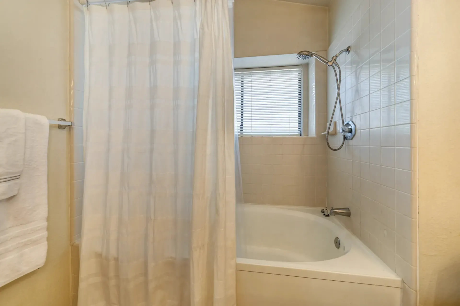 Spa-like primary bathroom with a dual sink vanity, an oval tub/shower combo with a bench, and two shower heads (including a handheld showerhead.)