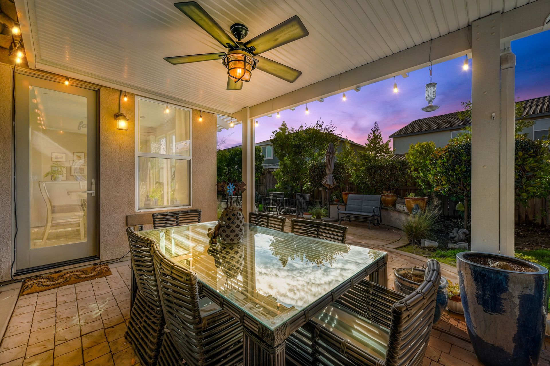 French door leads to a 93’ wide, beautifully landscaped backyard with a covered patio with a ceiling fan, multiple entertaining areas, grass, plenty of room for a pool, a gas stub for a BBQ, and a 6’ x 12’ Tuff Shed.