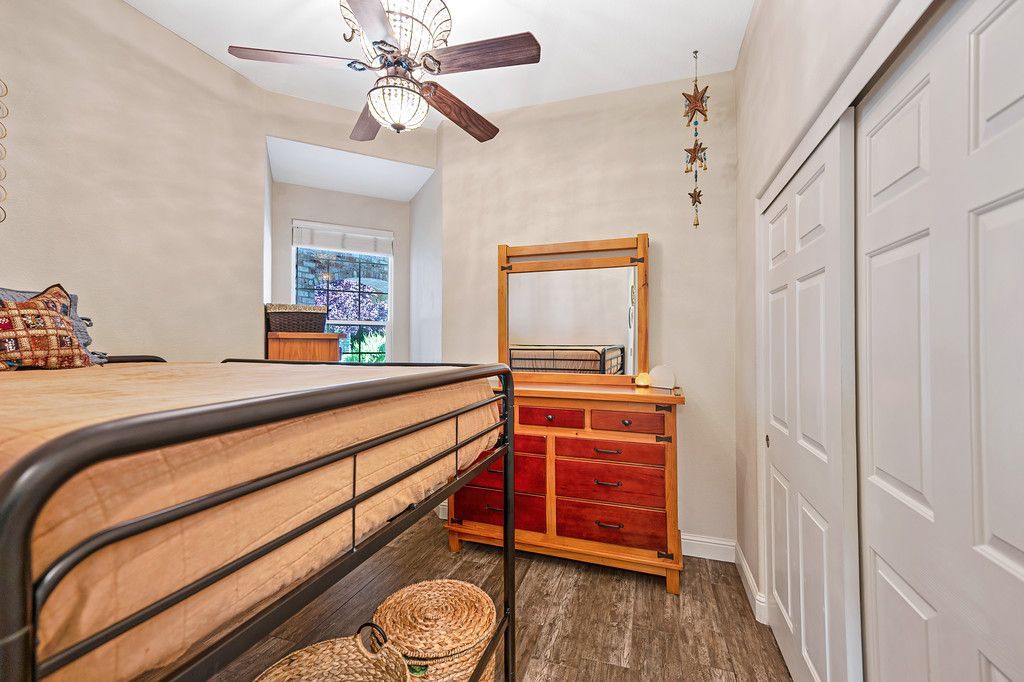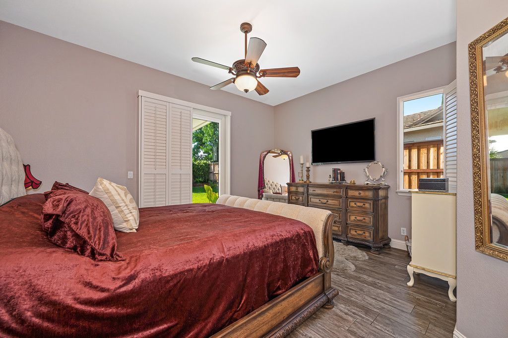 Elegant primary suite with a walk-in closet and a sliding glass door with plantation shutters to the gorgeous backyard.