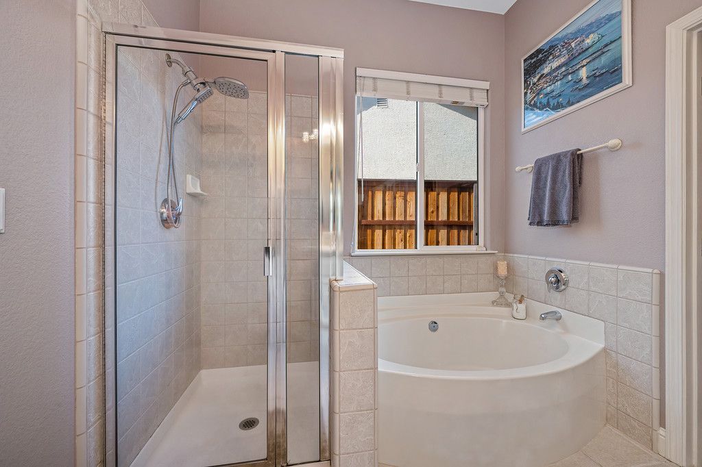 Spa-like primary bathroom with a dual sink vanity, updated lighting, soaking tub, and a glass enclosed shower with a rain showerhead.