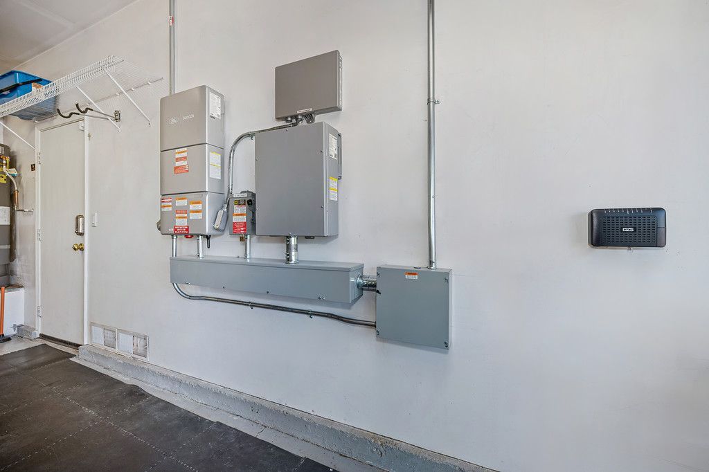 The 3-car garage is a workshop ready space featuring textured walls, Electrostatic Discharge flooring, overhead storage, and integrated EV charging capability. This home is engineered for modern living and independence with resilient energy and tech infrastructure. Some of these features include owned solar ($43,550 value) which is a turnkey owned solar system with the 80A Charge Station Pro, Ford Home Integration System, and "Dark Start" capability (the system can wake itself up if the grid goes down).