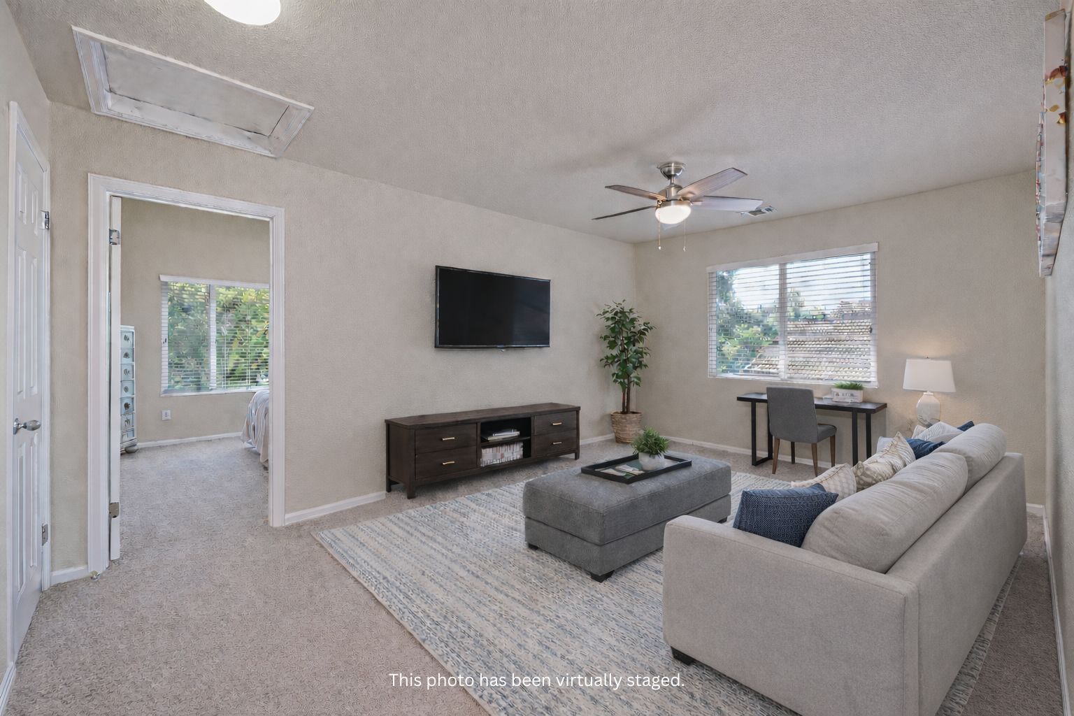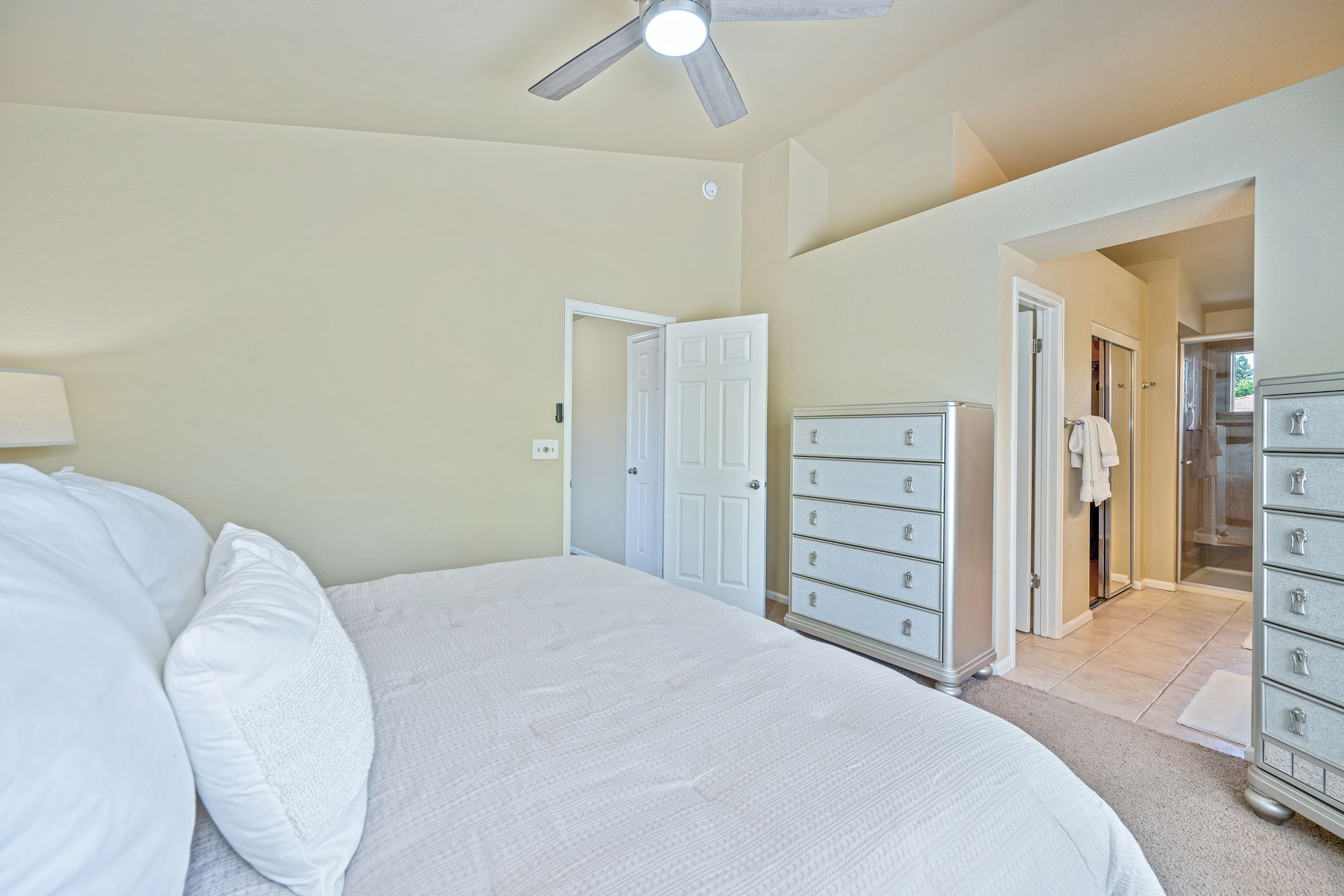 Spacious primary suite with vaulted ceilings and a walk-in closet.