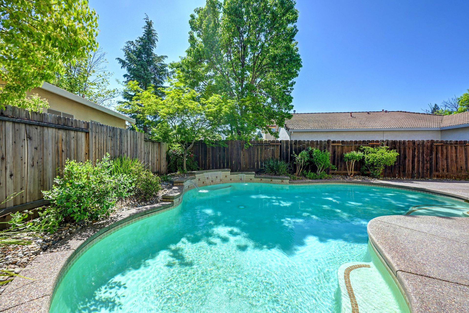 The resort-style backyard is a true retreat, highlighted by a gated sparkling saltwater pool with sheer descent waterfalls and a Cabo shelf, palm trees, garden boxes, and wide side yards..