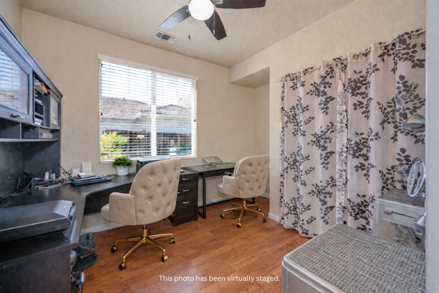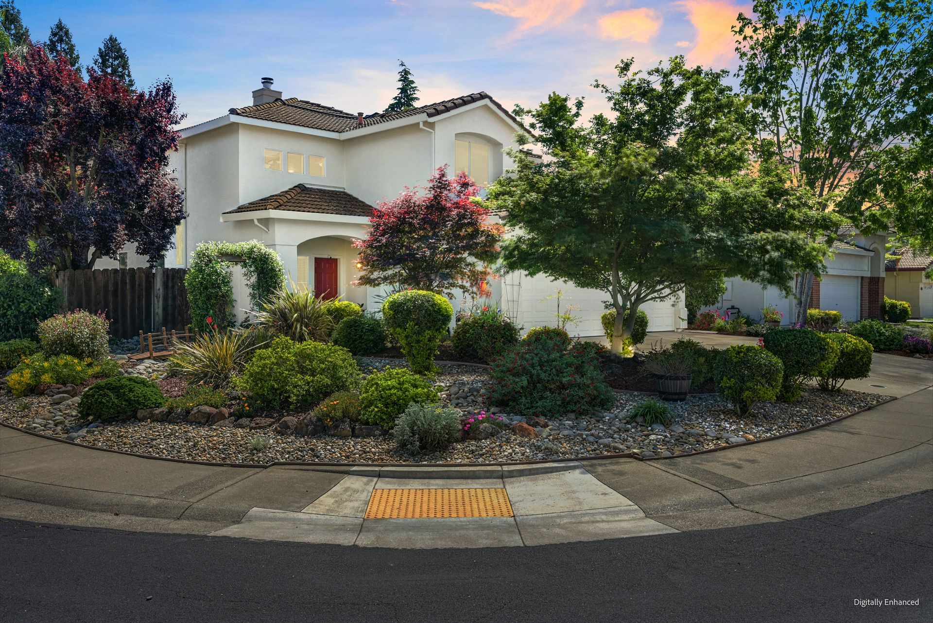 Charming curb appeal with Spanish style exterior, gorgeous landscaping, newer paint, a covered porch, and a Ring camera doorbell. Hardwood laminate flooring, ceiling fans, and newer interior paint.