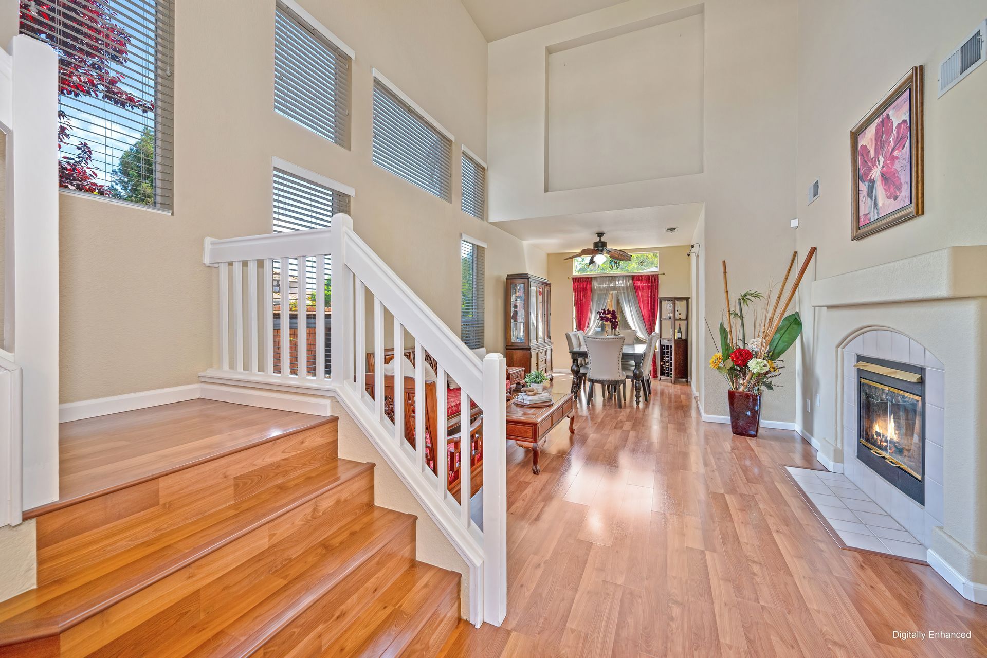 Inviting foyer with impressive open white staircase.