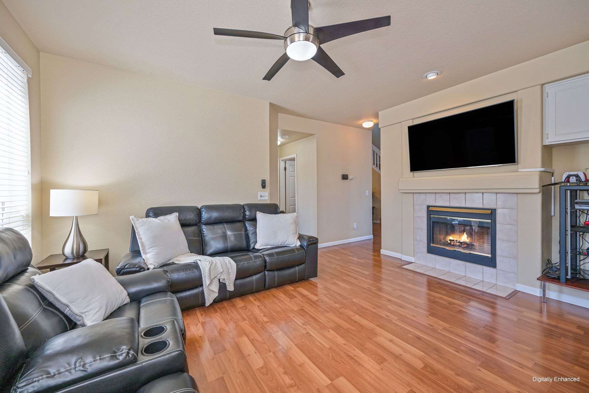 Spacious gathering room with the dual sided fireplace.