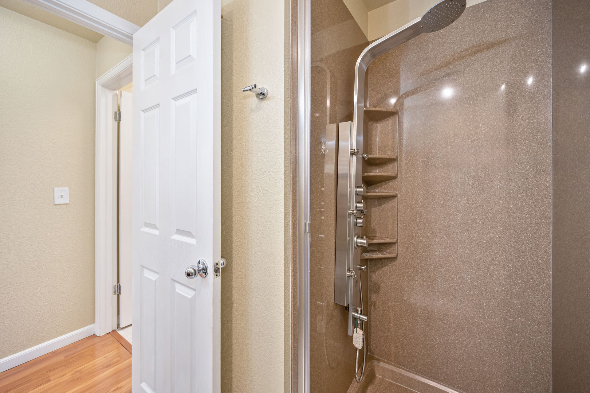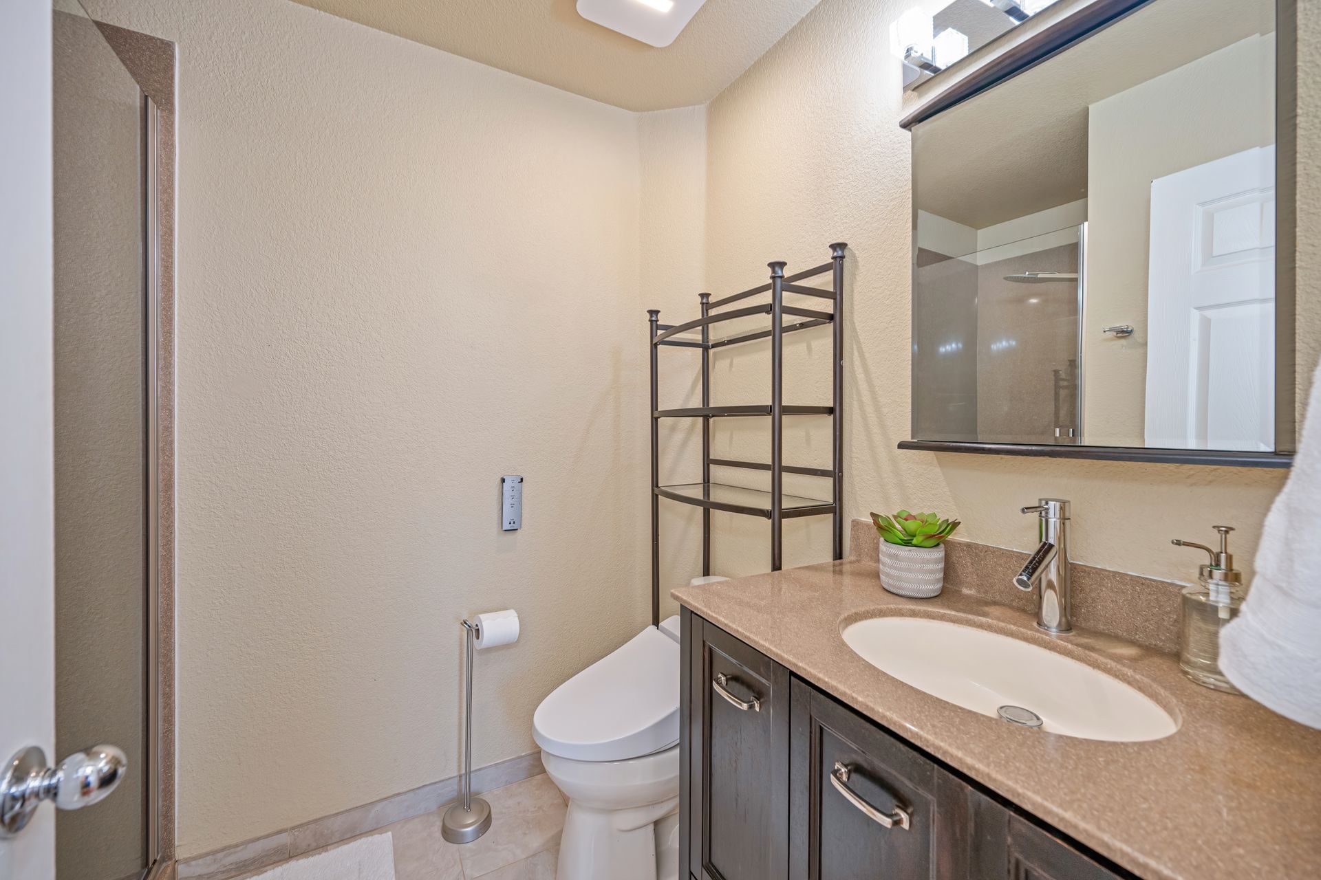 Downstairs bedroom and full bathroom with an updated vanity and shower with a glass door and jet shower massage panel system.