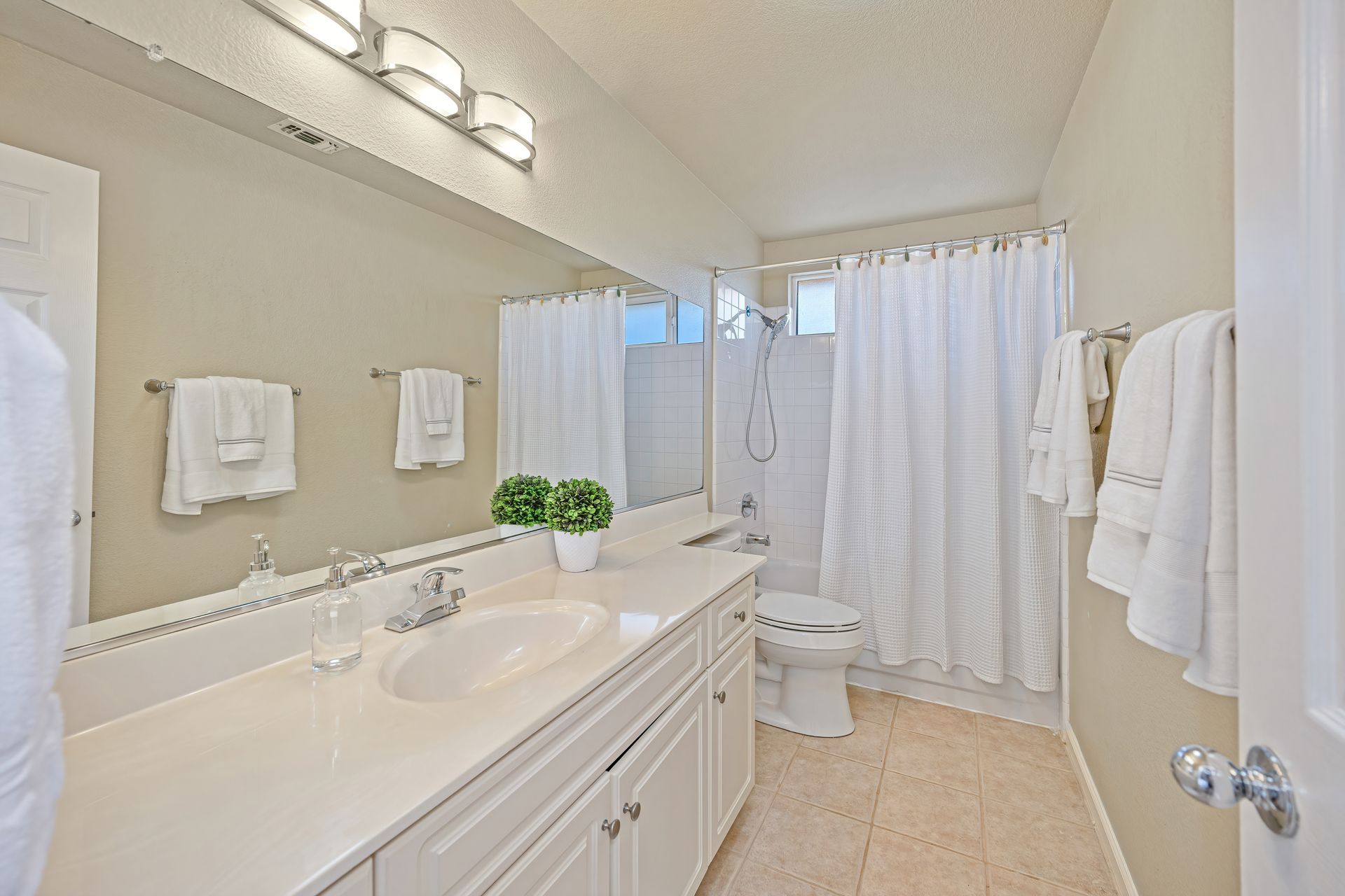 Secondary bathroom upstairs with a large vanity and tub/shower combo with a handheld showerhead.