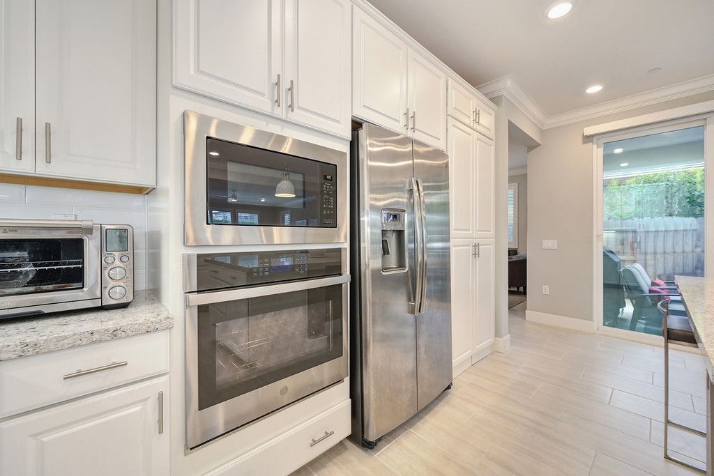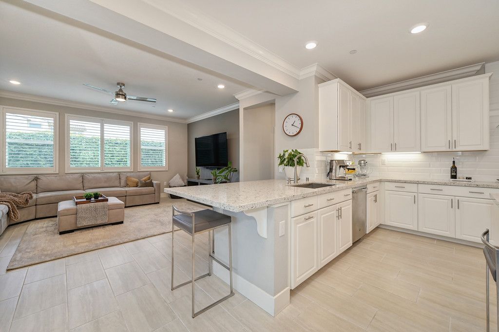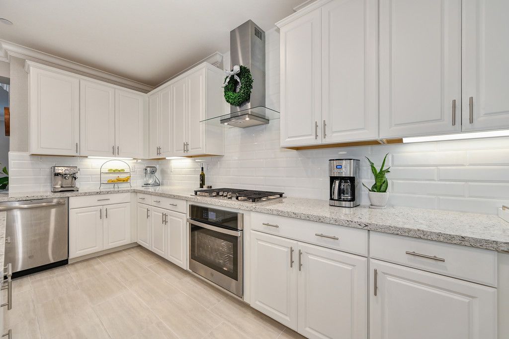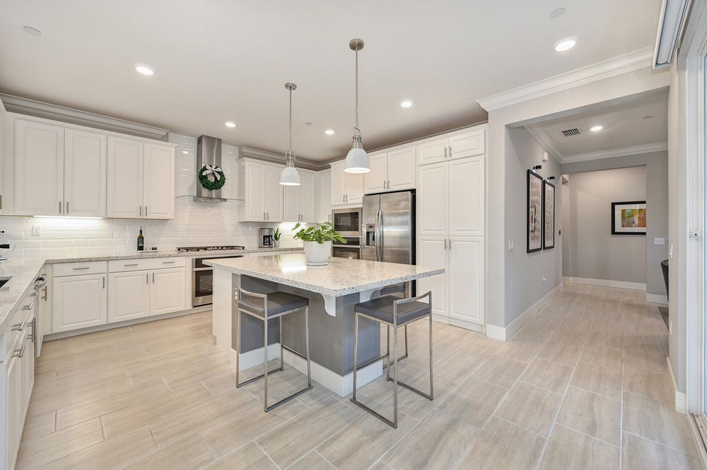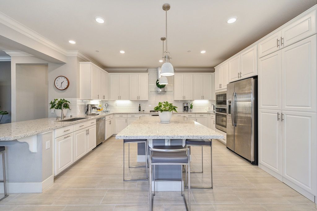 Stunning kitchen with a huge island with storage and counter seating, pendant lighting, quartz countertops, popular white cabinetry with decorative hardware, roll-outs, and soft close, under cabinet lighting, decorative subway tile backsplash, stainless steel appliances (including two ovens, a built-in cooktop, and upgraded hood), and a hidden walk-in pantry.