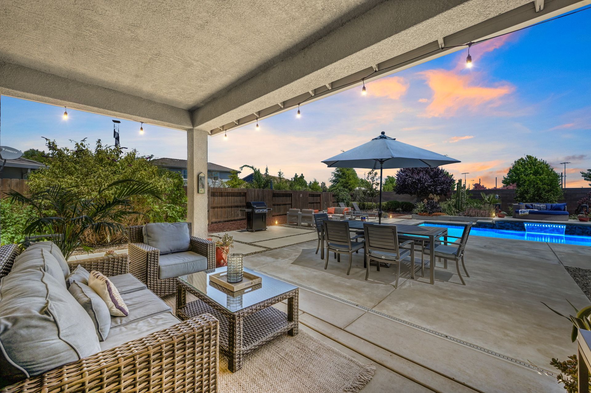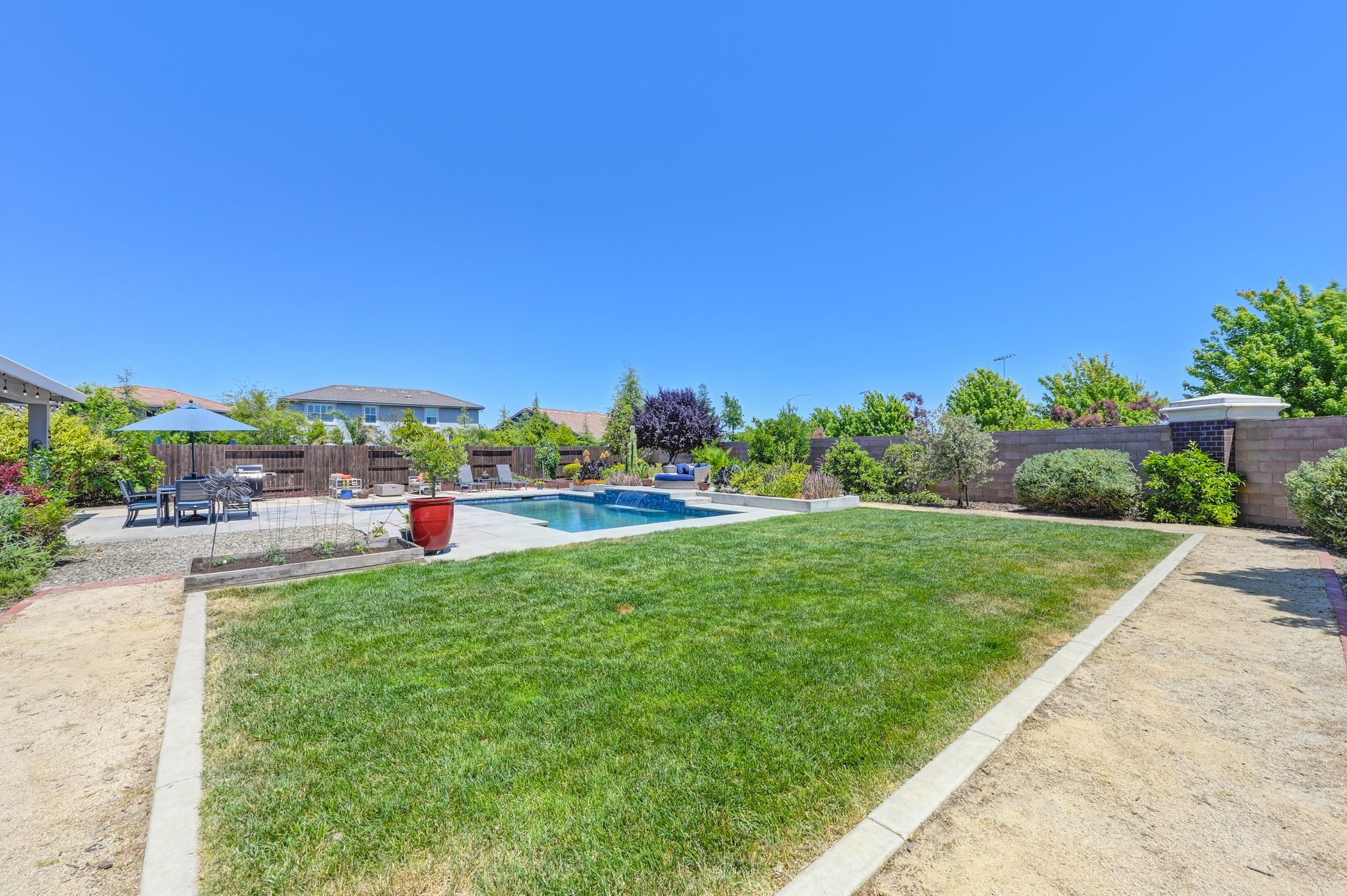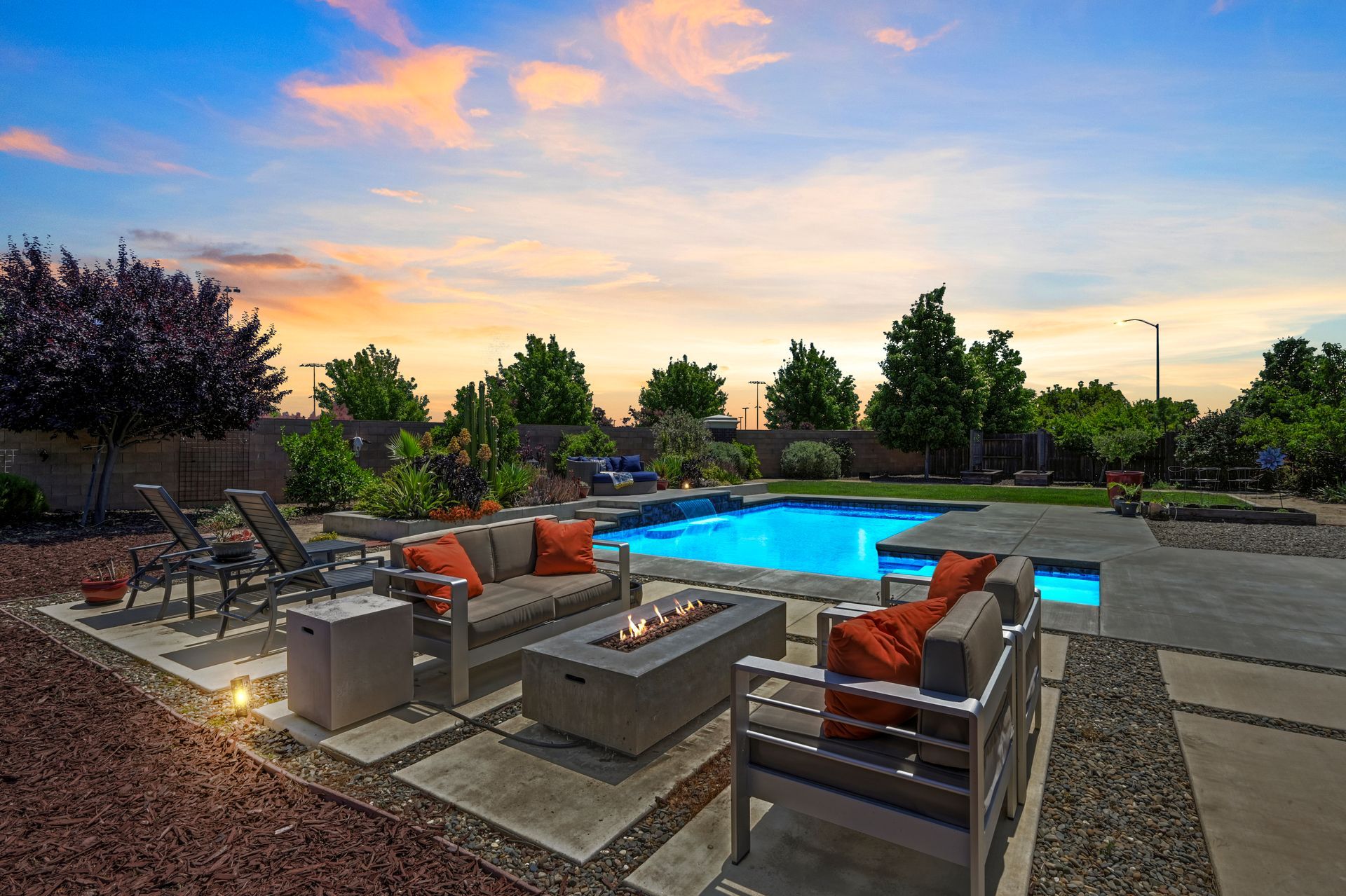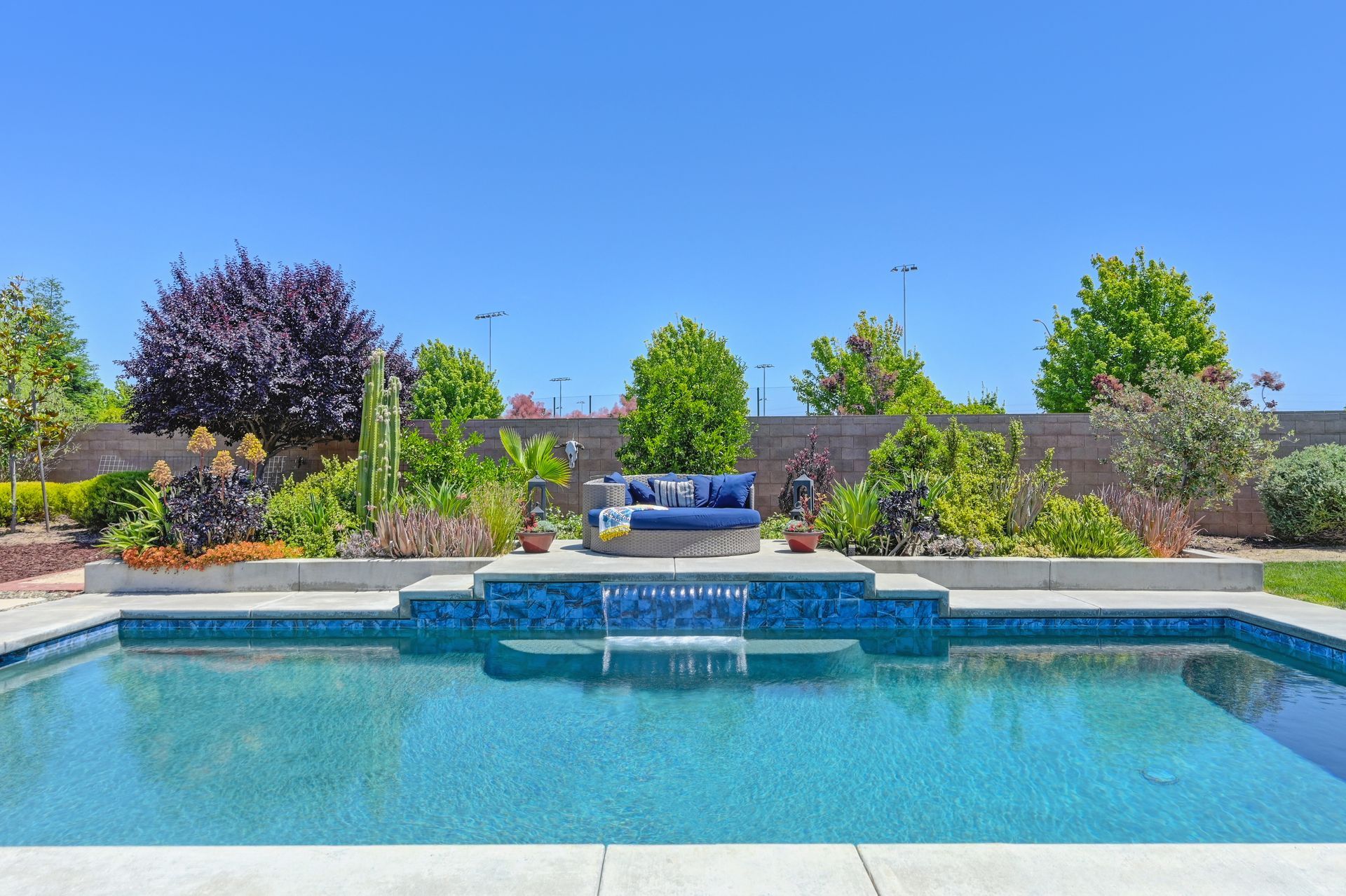 Host unforgettable gatherings in the expansive backyard, featuring a covered patio, a sleek, modern saltwater pool with a sheer descent waterfall and a Cabo shelf with umbrella holder.