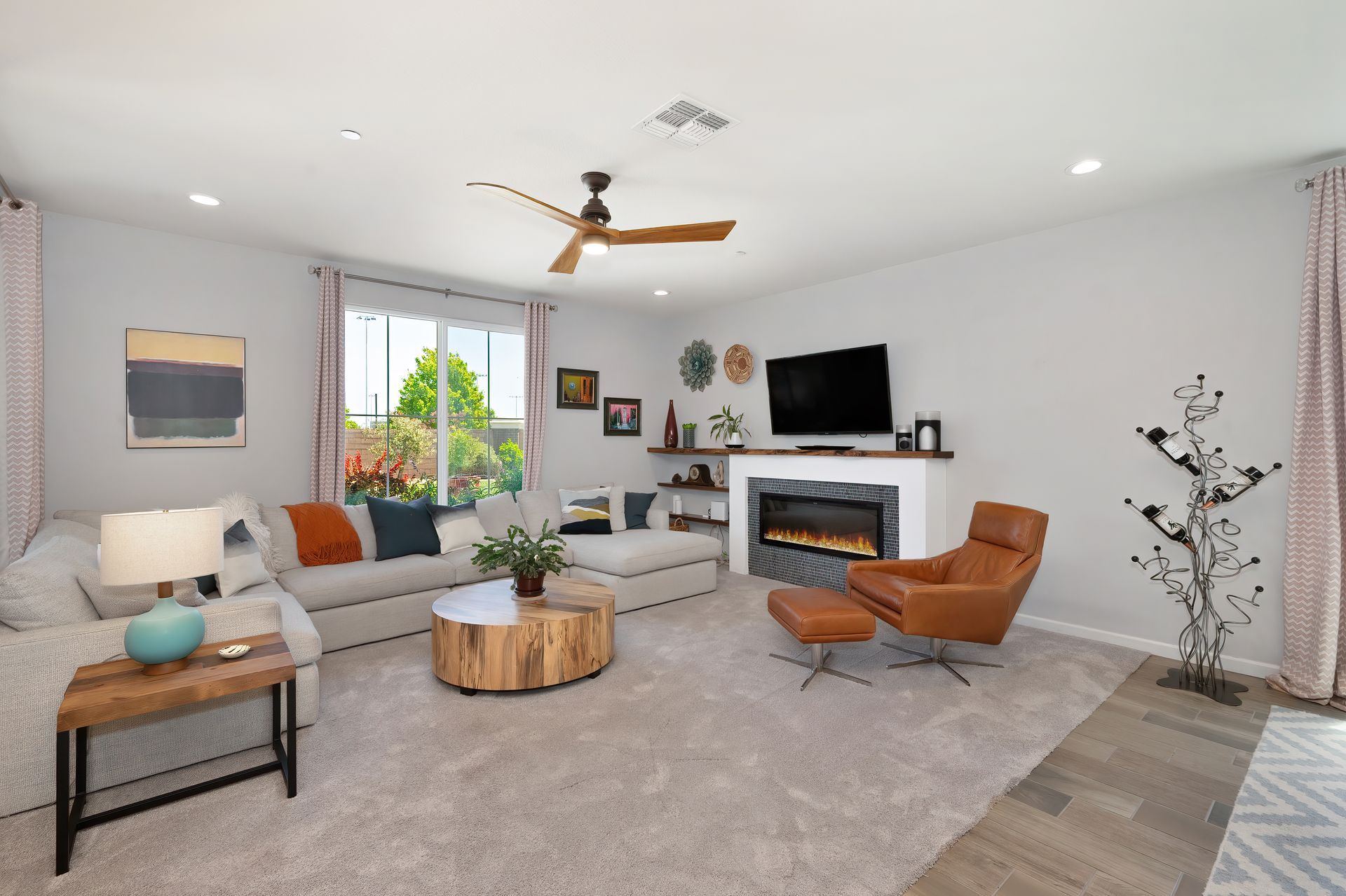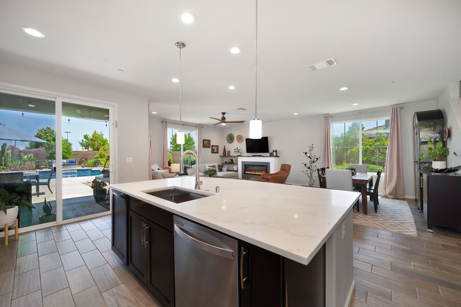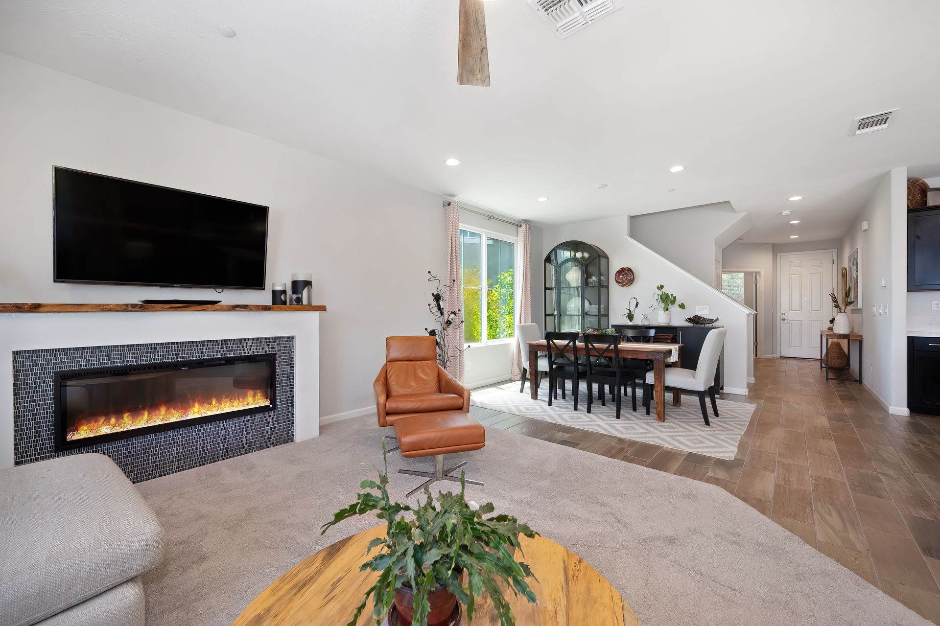 Great room with a large gathering area with an electric fireplace with a mantle, a dining area, and a stunning kitchen.