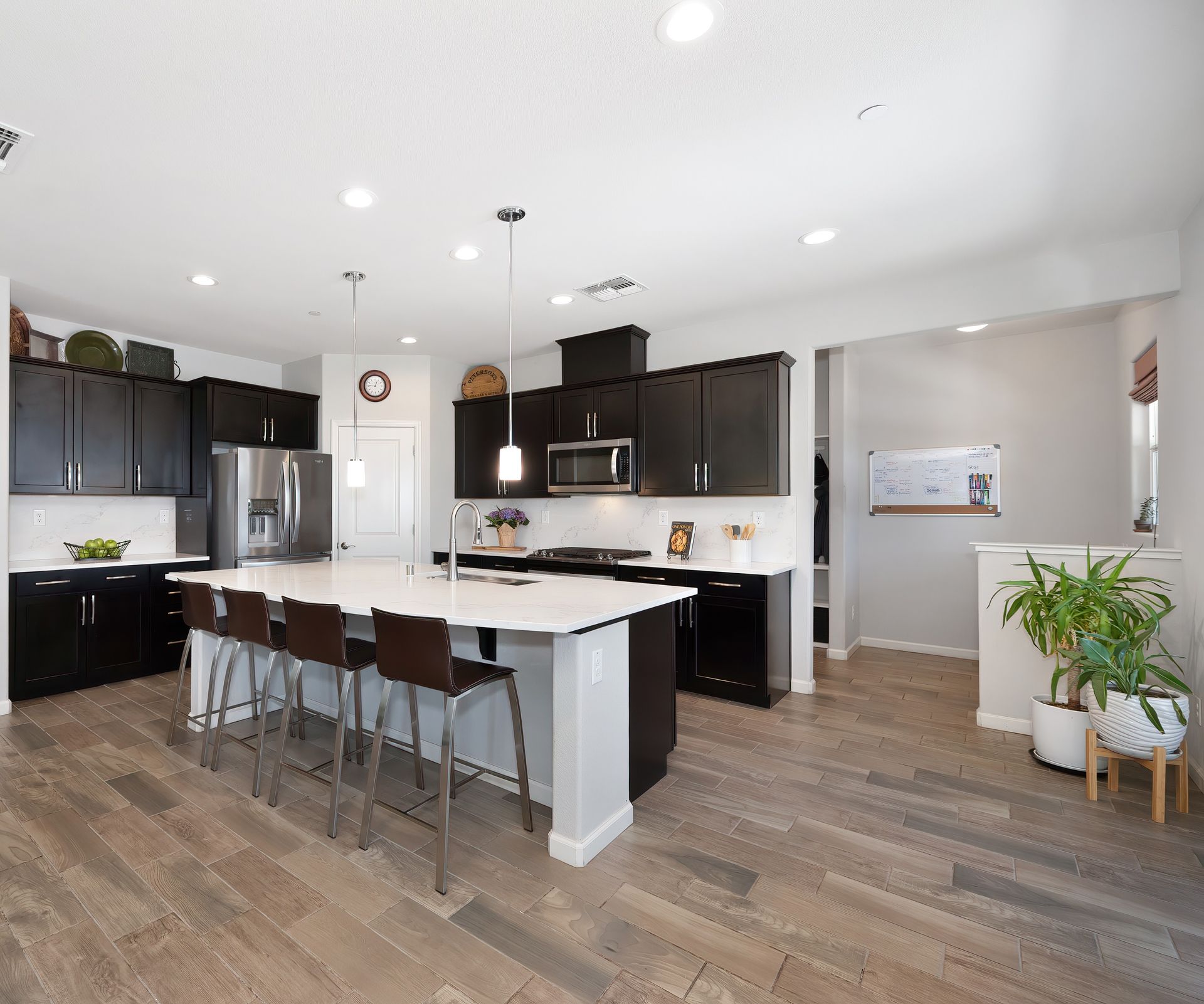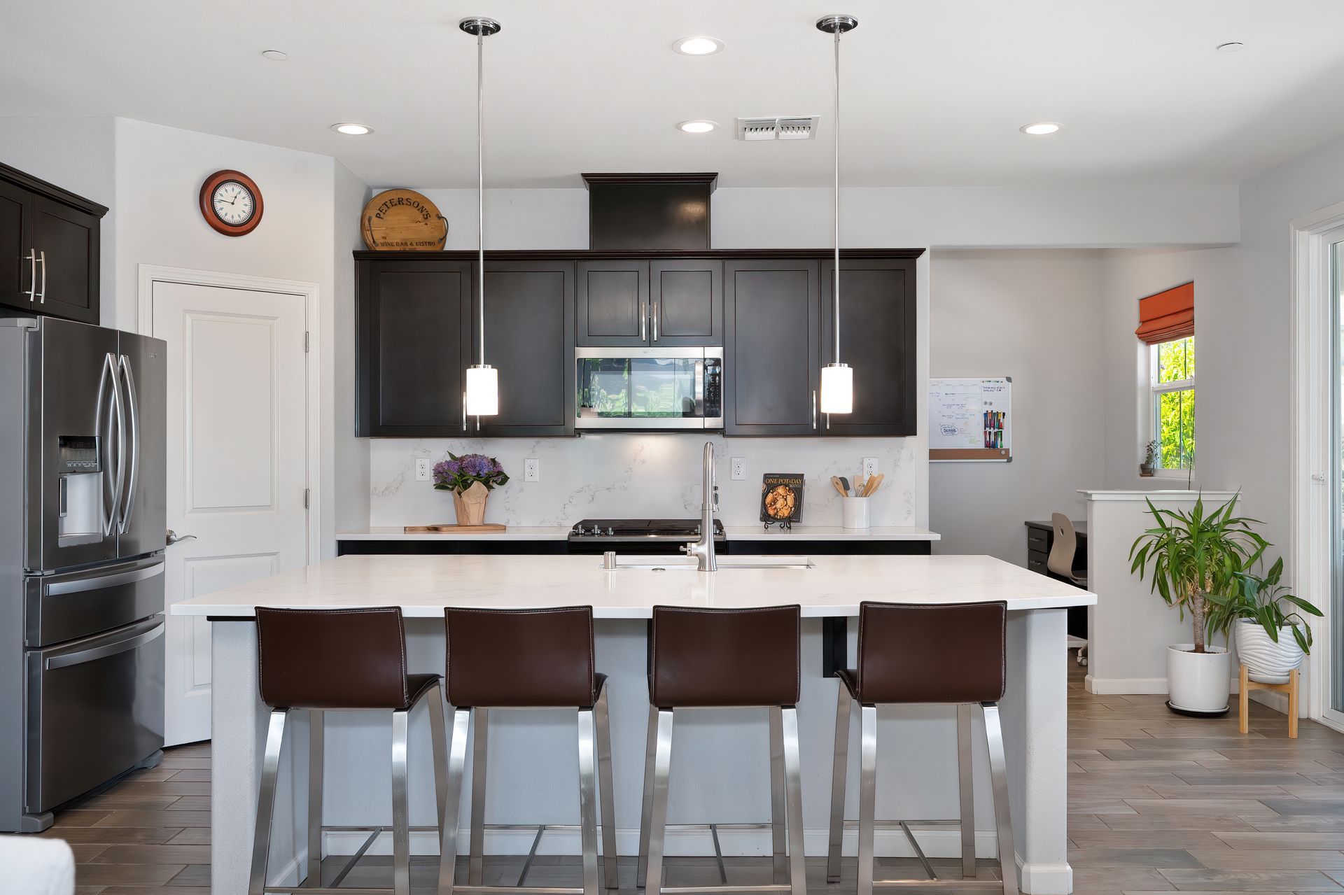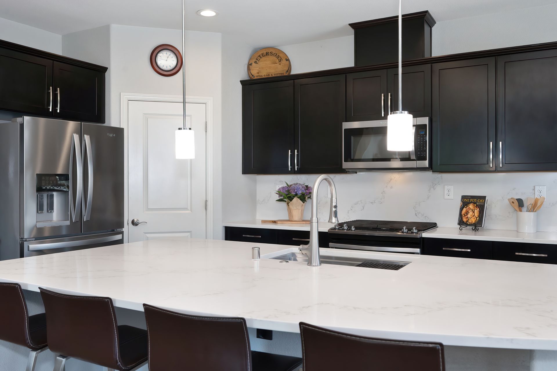 Kitchen features a large island with counter seating, new quartz countertops with full quartz backsplash, new Elkay stainless steel sink and Kohler touch free faucet, café area, upgraded cabinetry with decorative hardware, pendant lighting, and a walk-in pantry.