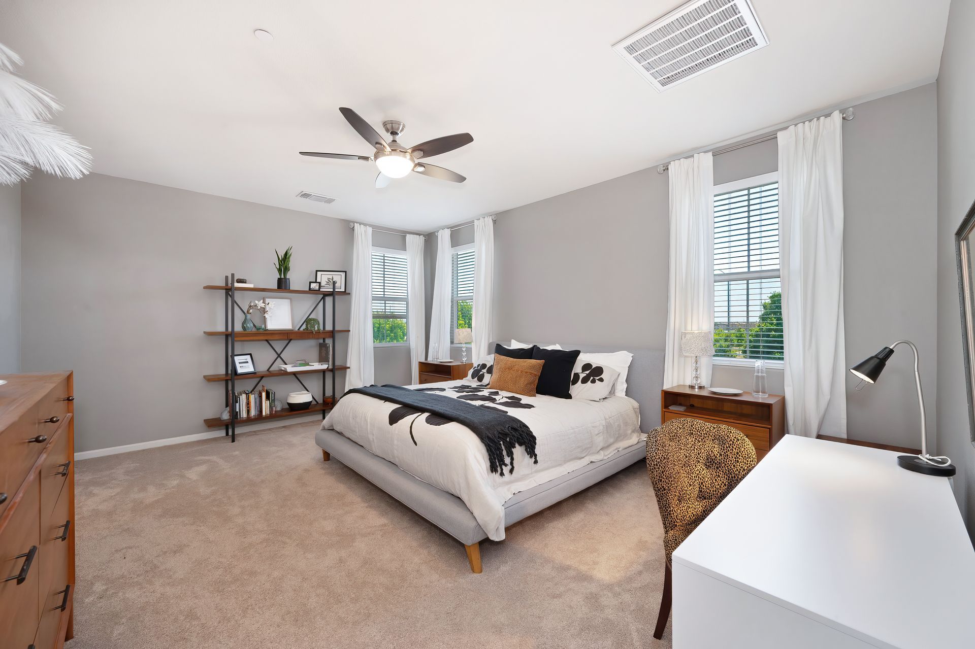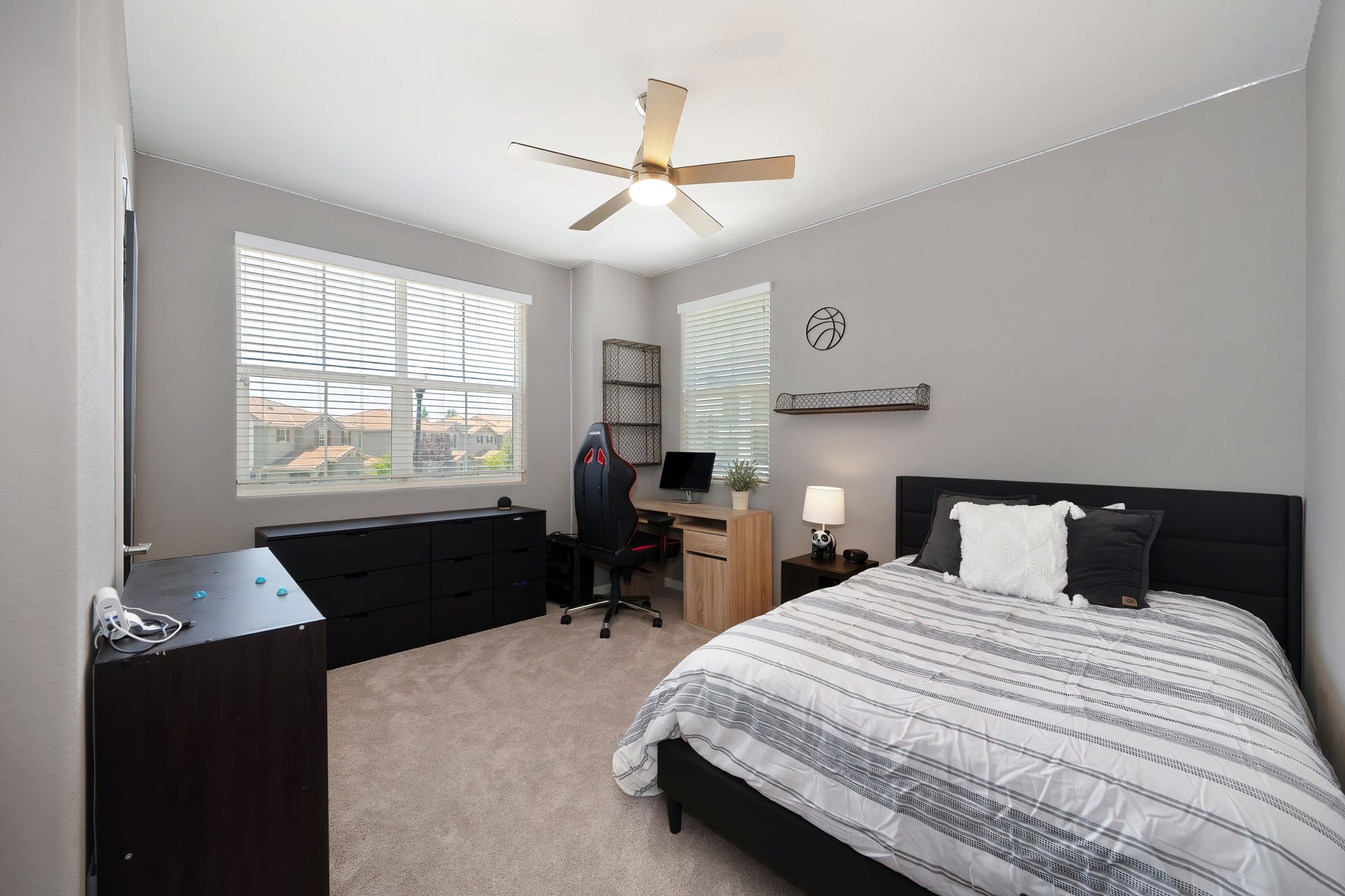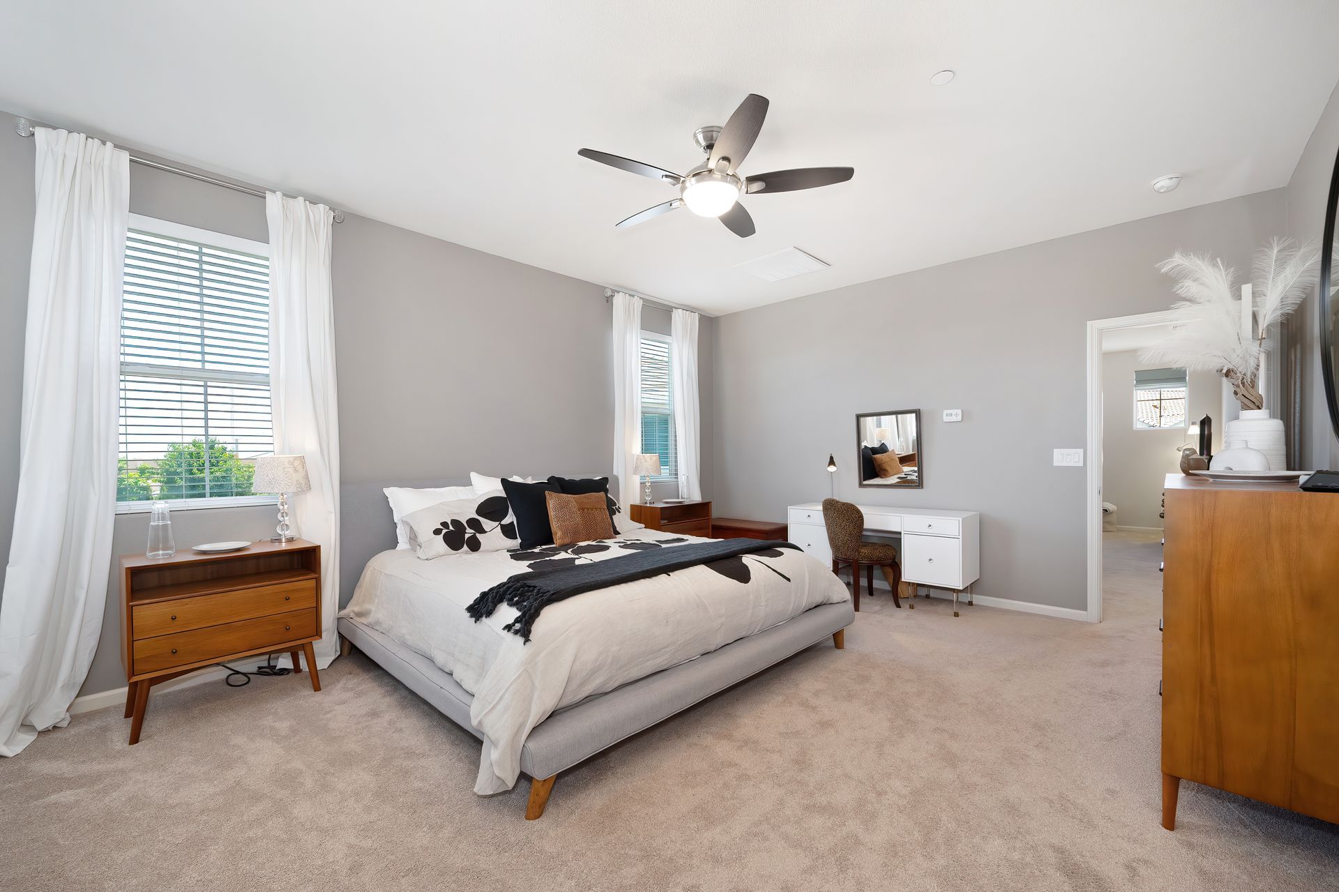 Private and spacious primary suite with abundant natural light, a walk-in closet, and views of the Sierras.