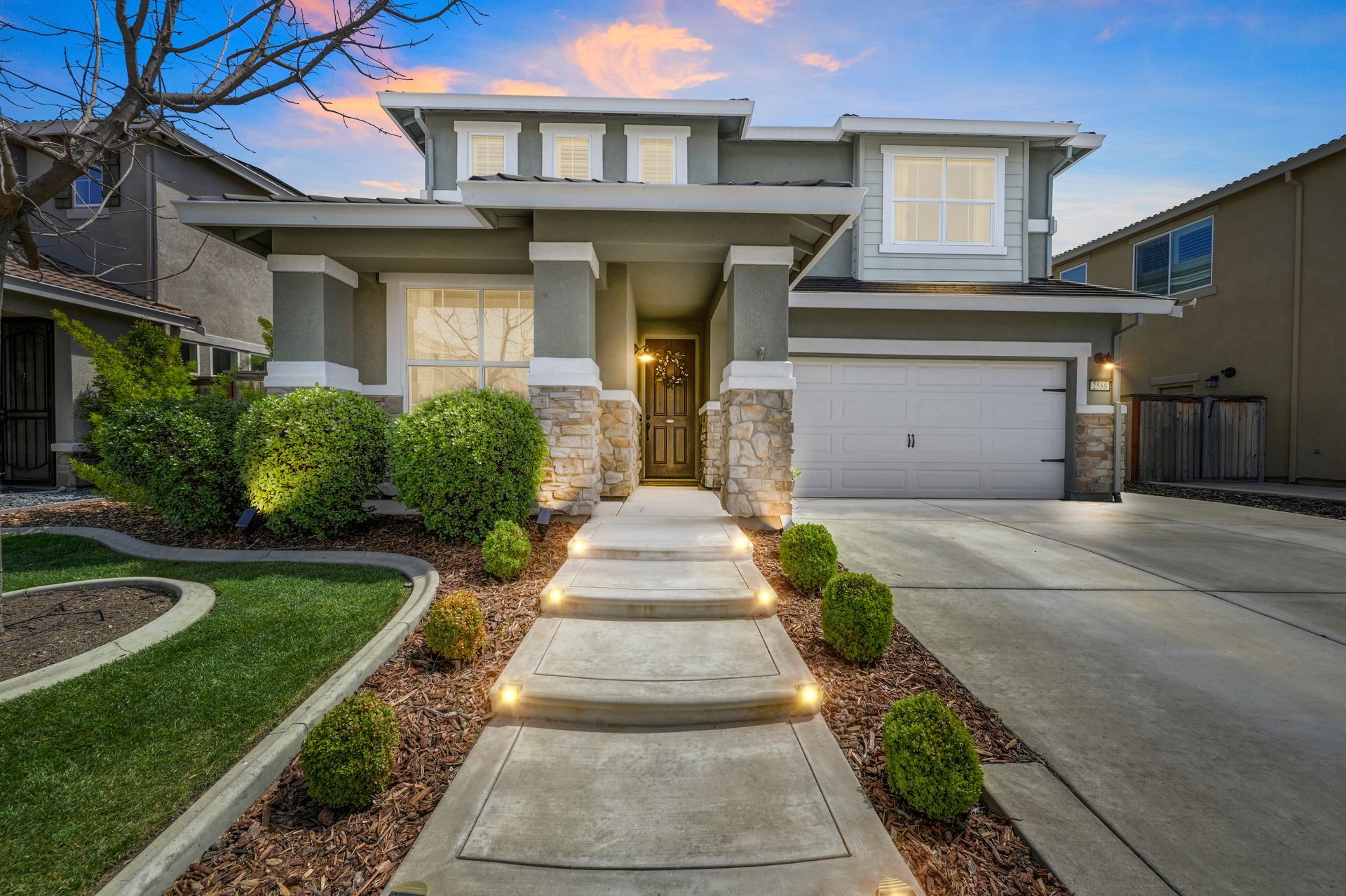 Gorgeous curb appeal with a modern craftsman elevation with stonework, updated lighting, an extended driveway, illuminated concrete steps to a covered porch, and a RING camera doorbell.