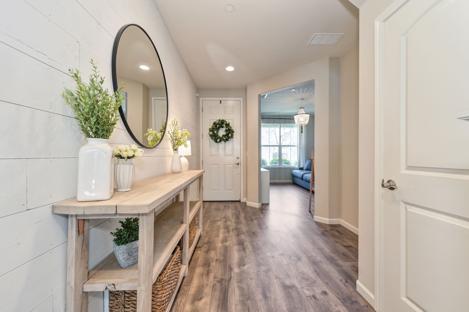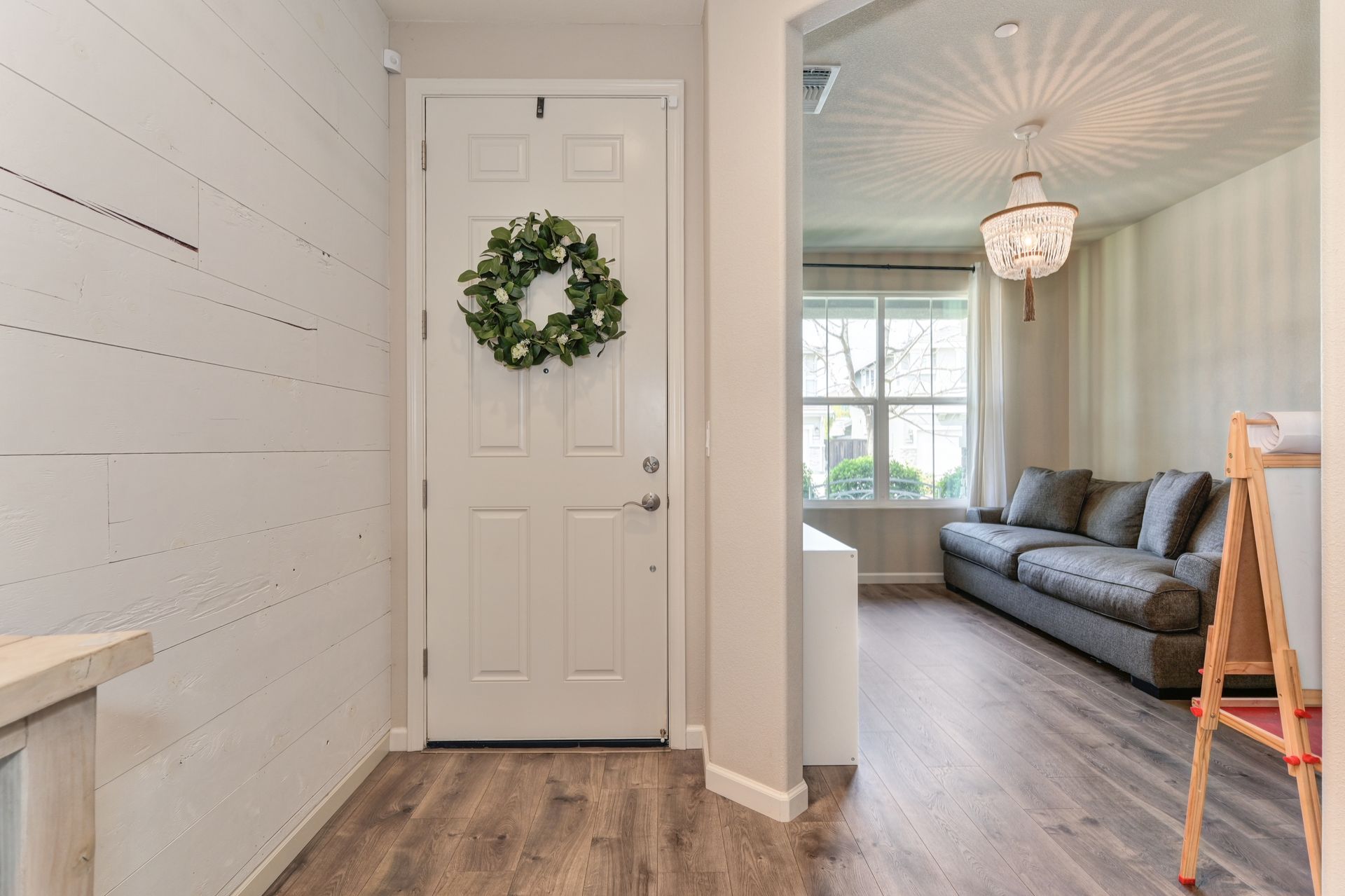 Beautiful entry with a reclaimed wood shiplap style statement wall.
