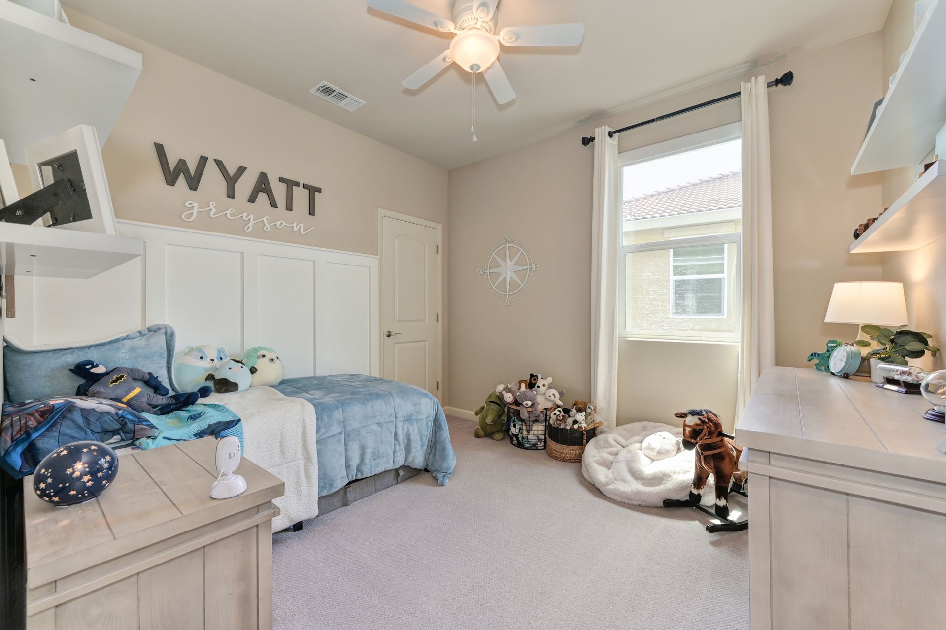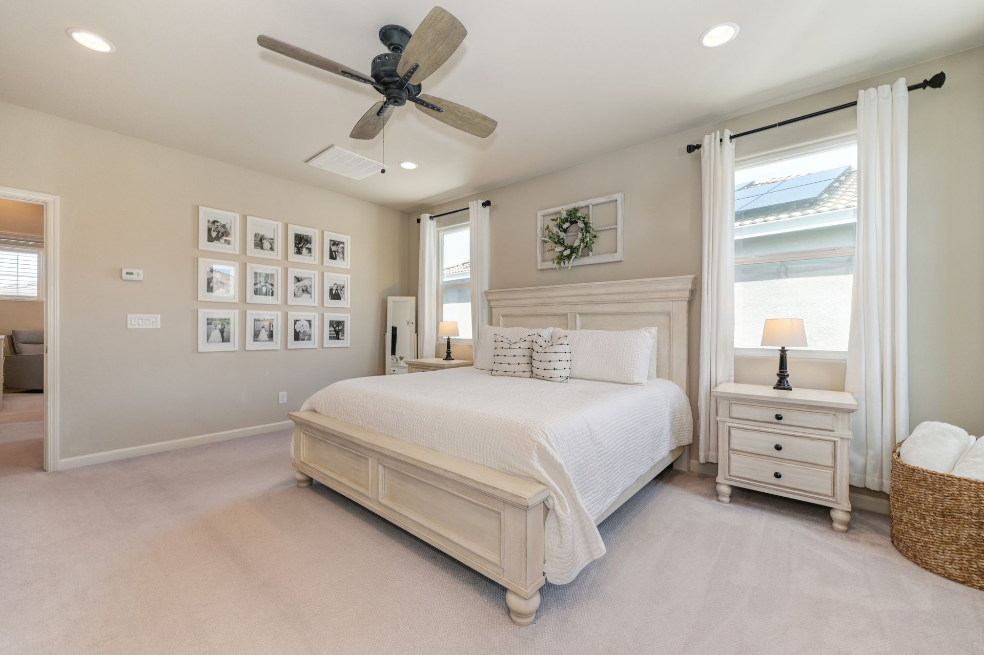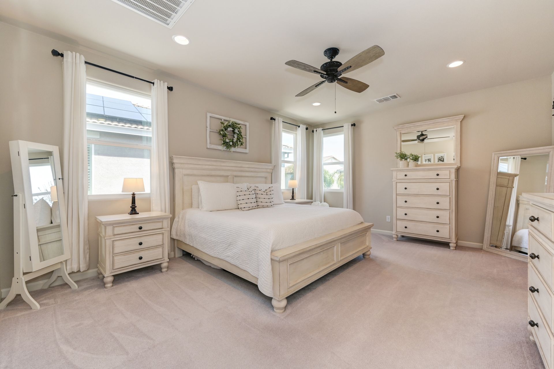 Spacious primary suite with a ceiling fan and walk-in closet with shelving.