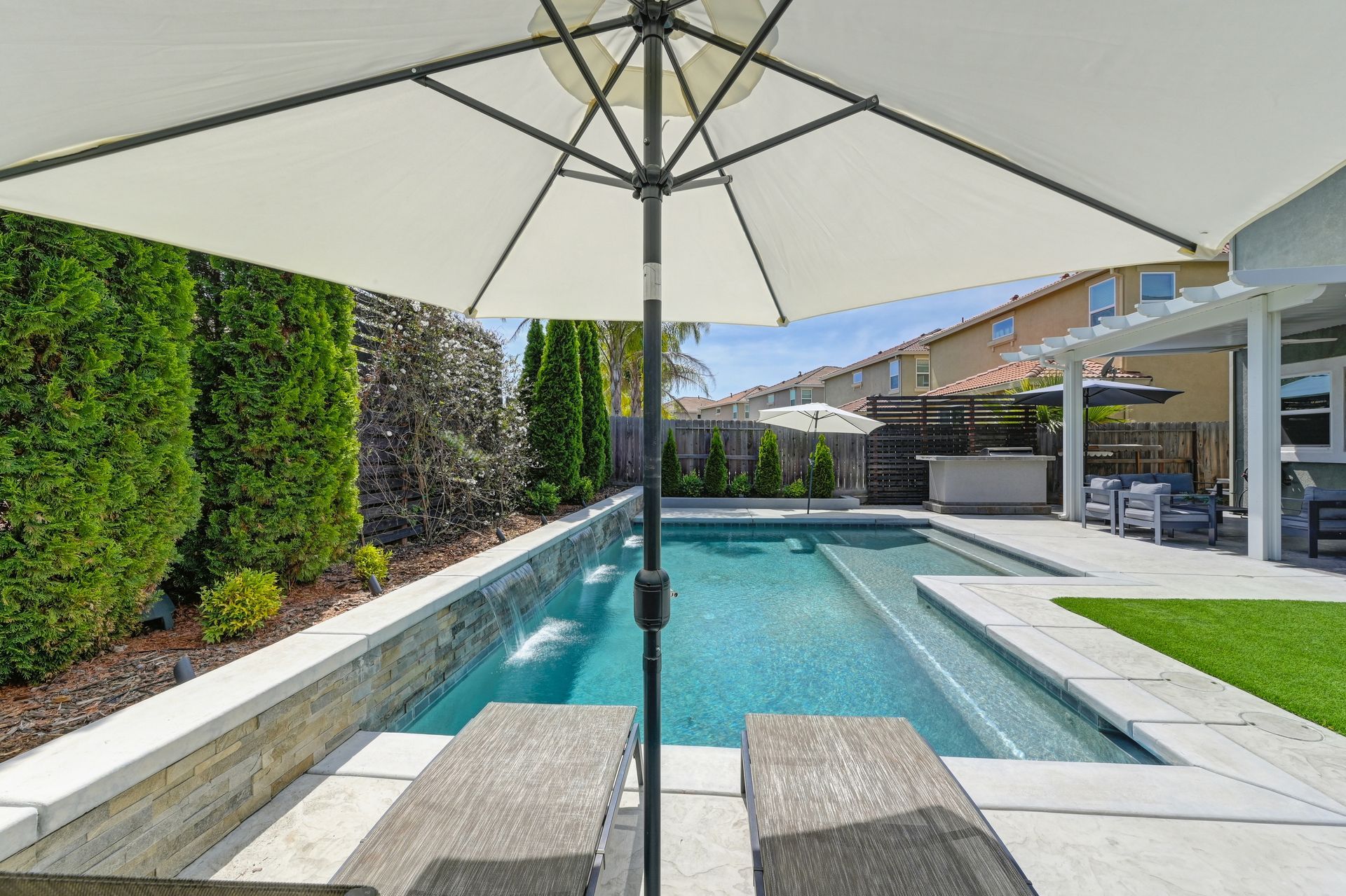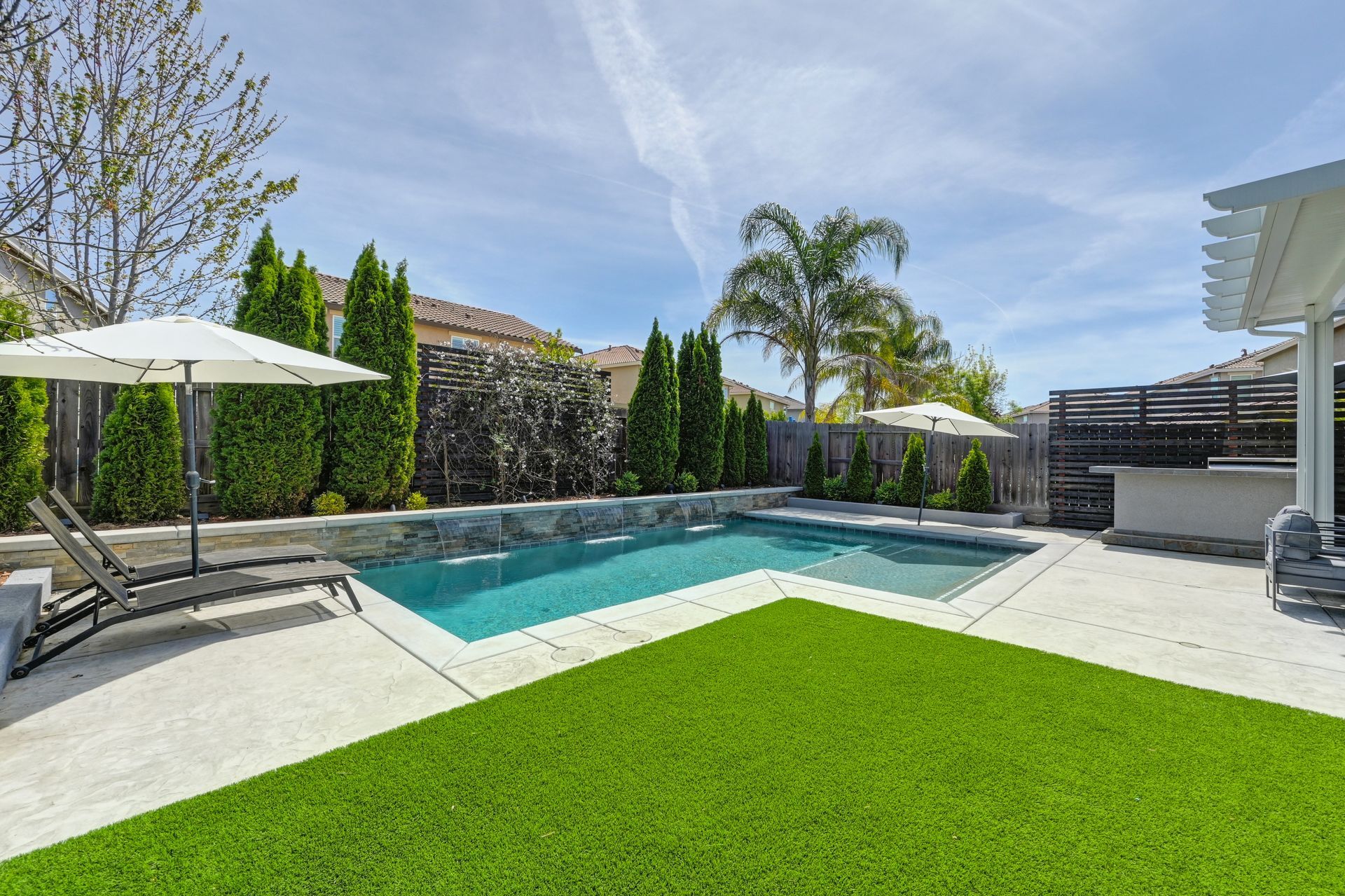 Resort style backyard with a sparkling, modern saltwater pool with gorgeous sheer descents and a huge Cabo shelf with room to hold umbrellas, a patio cover with lighting and ceiling fan, an outdoor kitchen with a BBQ and a refrigerator, artificial grass, stamped concrete, and mature trees and trellises for privacy.