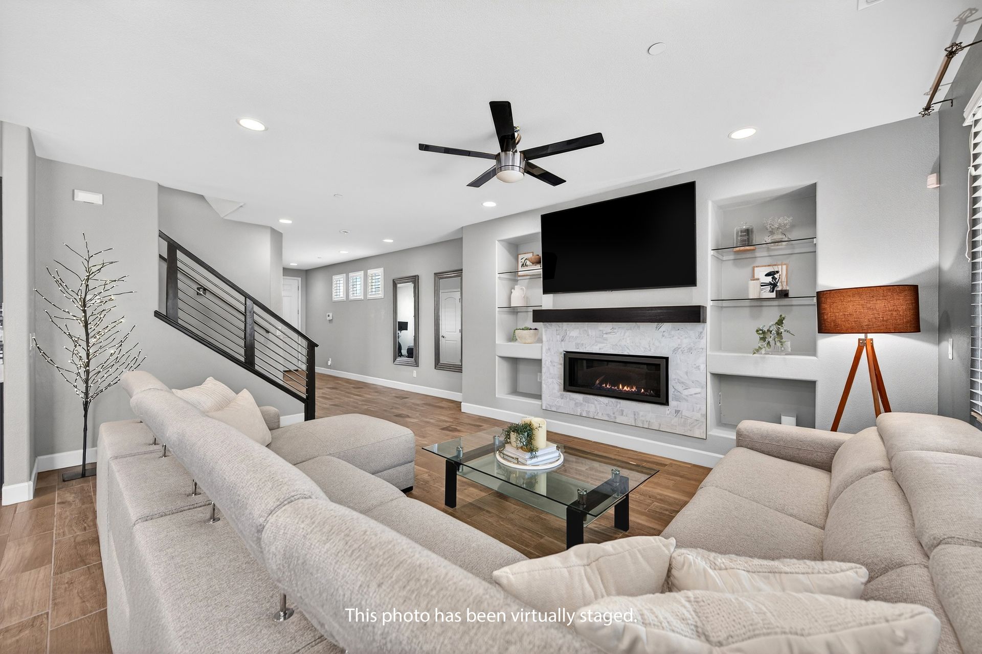 Impressive modern stair rail leads to a spacious loft with updated lighting for hangouts.