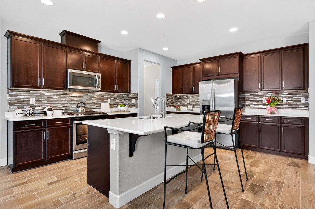 Entertainer's delight of a kitchen features a large island with counter seating, quartz countertops, rich cabinetry with decorative hardware, decorative tile backsplash, stainless steel appliances, a pantry, and a second walk-in pantry.