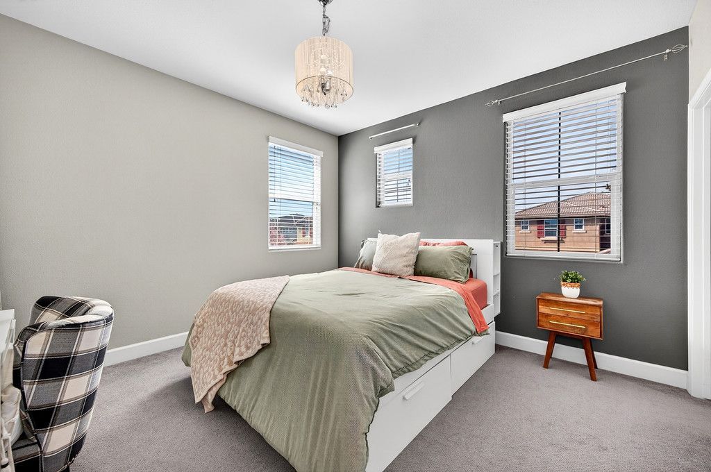 Two secondary bedrooms with chandeliers and another secondary bedroom with a ceiling fan.