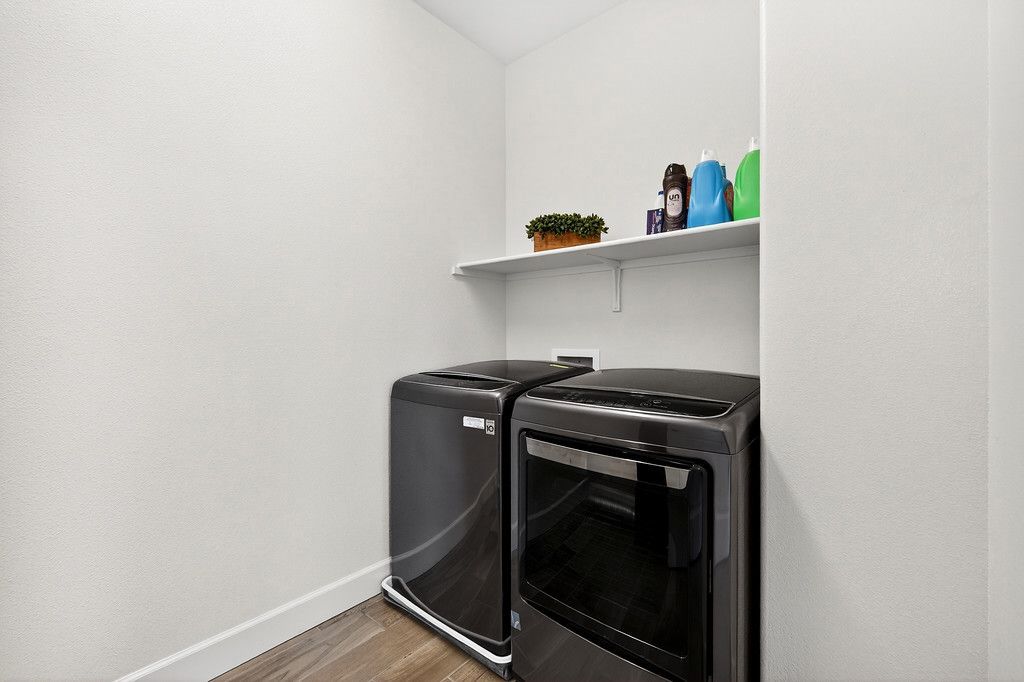 Upstairs laundry room with shelving.