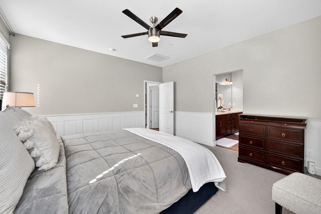 Spacious and elegant primary suite with wainscoting, room for a sitting area, and a large walk-in closet.