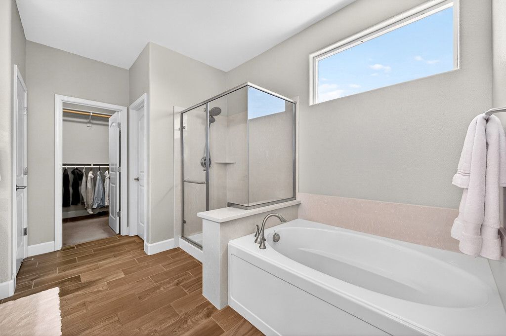 Relax in the spa-like primary bathroom with a large dual sink vanity with Piedrafina marble countertops, soaking tub, and a glass enclosed shower with a handheld showerhead.
