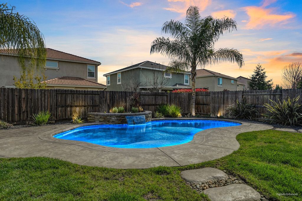 Host get-togethers in the resort style backyard with a sparkling saltwater pool with a Cabo shelf with an umbrella holder and tranquil sheer descents, covered patio with a ceiling fan, stamped concrete, palm trees, grassy area, and gated side yards.
