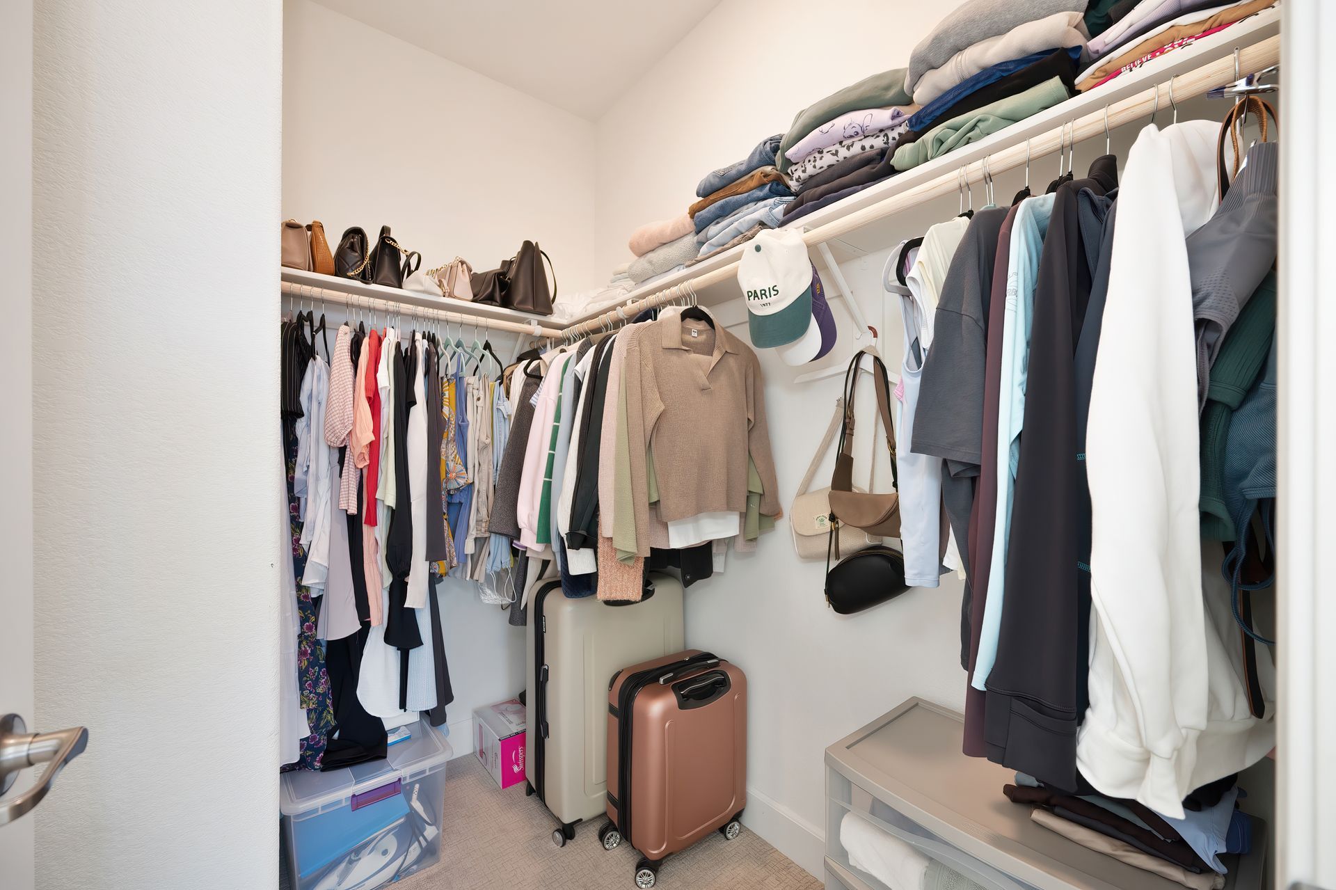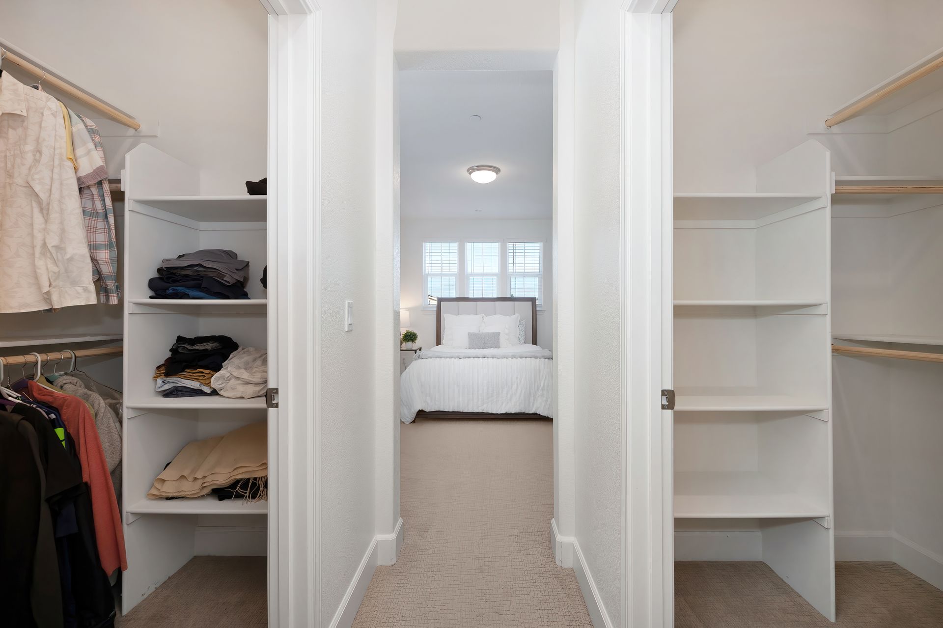 Spacious primary suite with ample natural light, two walk-in closets with shelving, and a gorgeous primary bathroom.