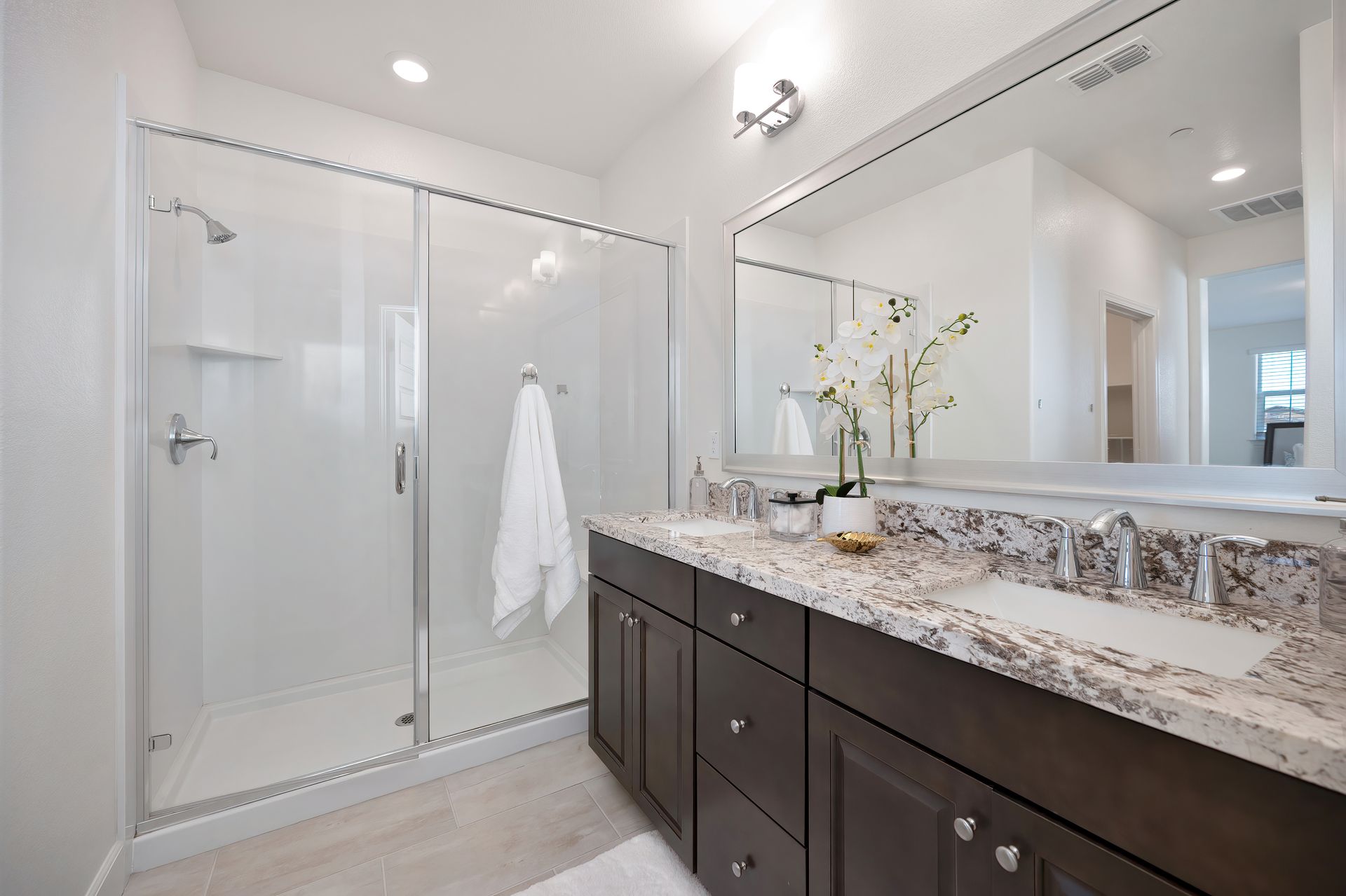 Elegant primary bathroom features a dual sink vanity with granite countertops, rich cabinetry with decorative hardware, a framed mirror, and a large glass enclosed shower with Piedrafina marble surround, a bench, and a shelf.