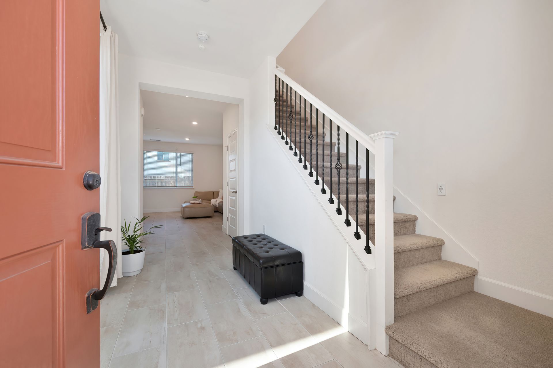 Inviting entry with a sliding glass door to the side yard and a walk-in coat closet.