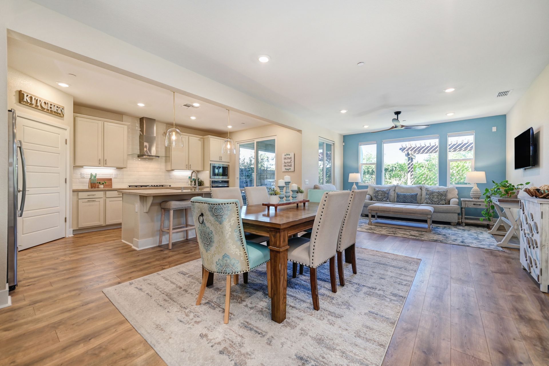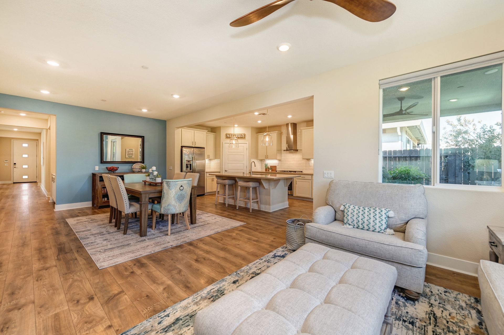 Popular great room with a gathering area with a modern ceiling fan, a dining area, and a stunning kitchen.