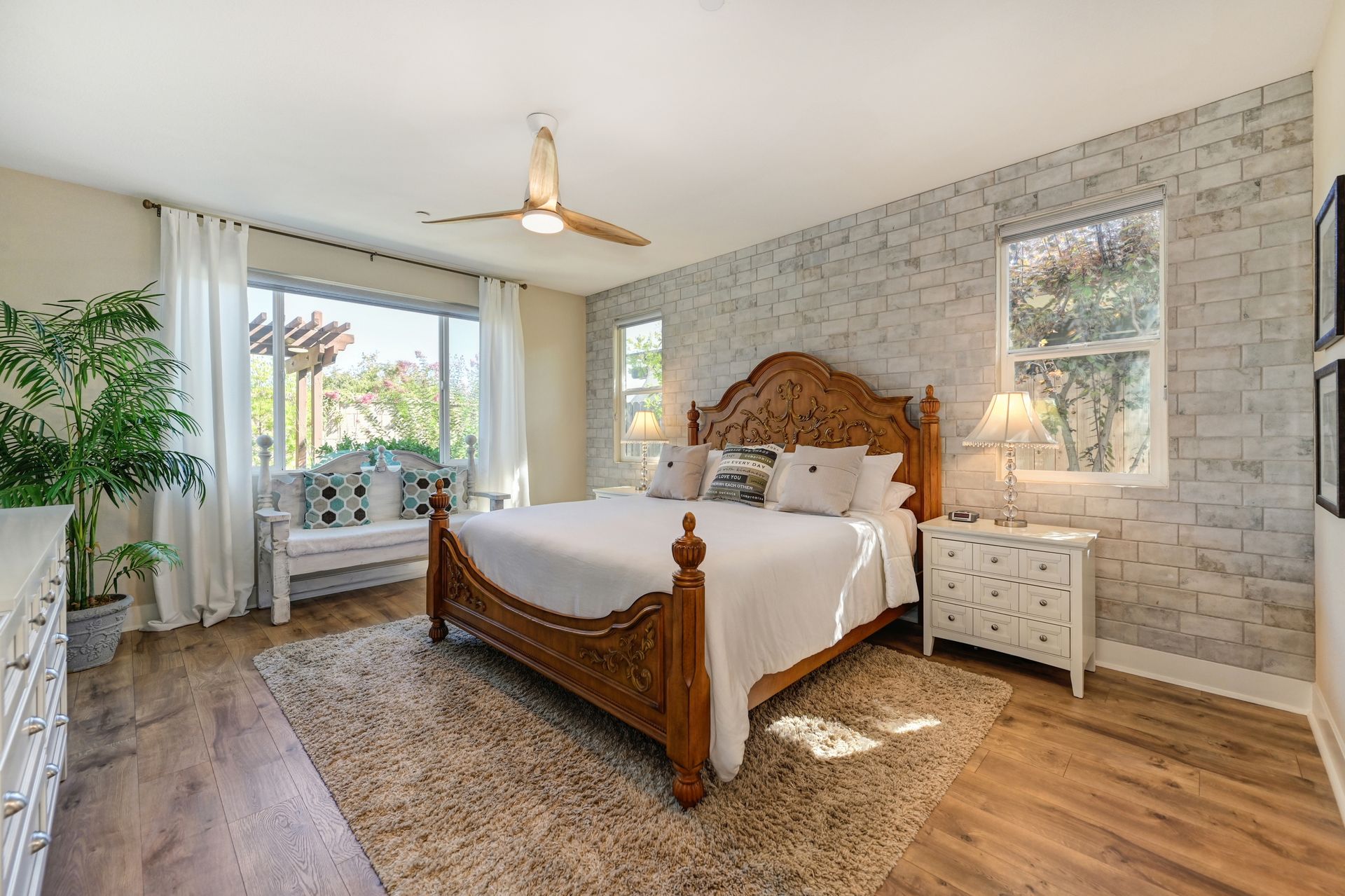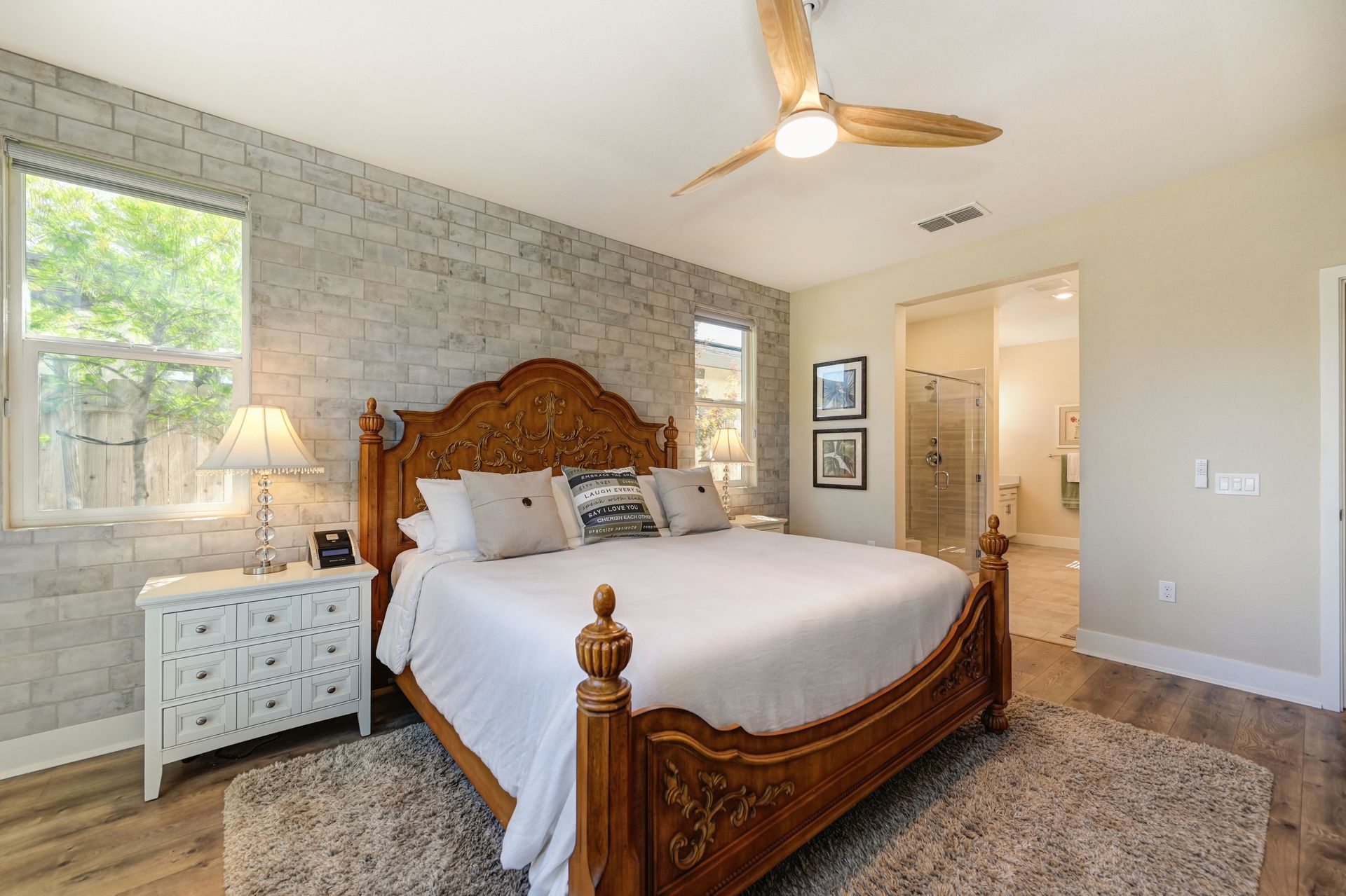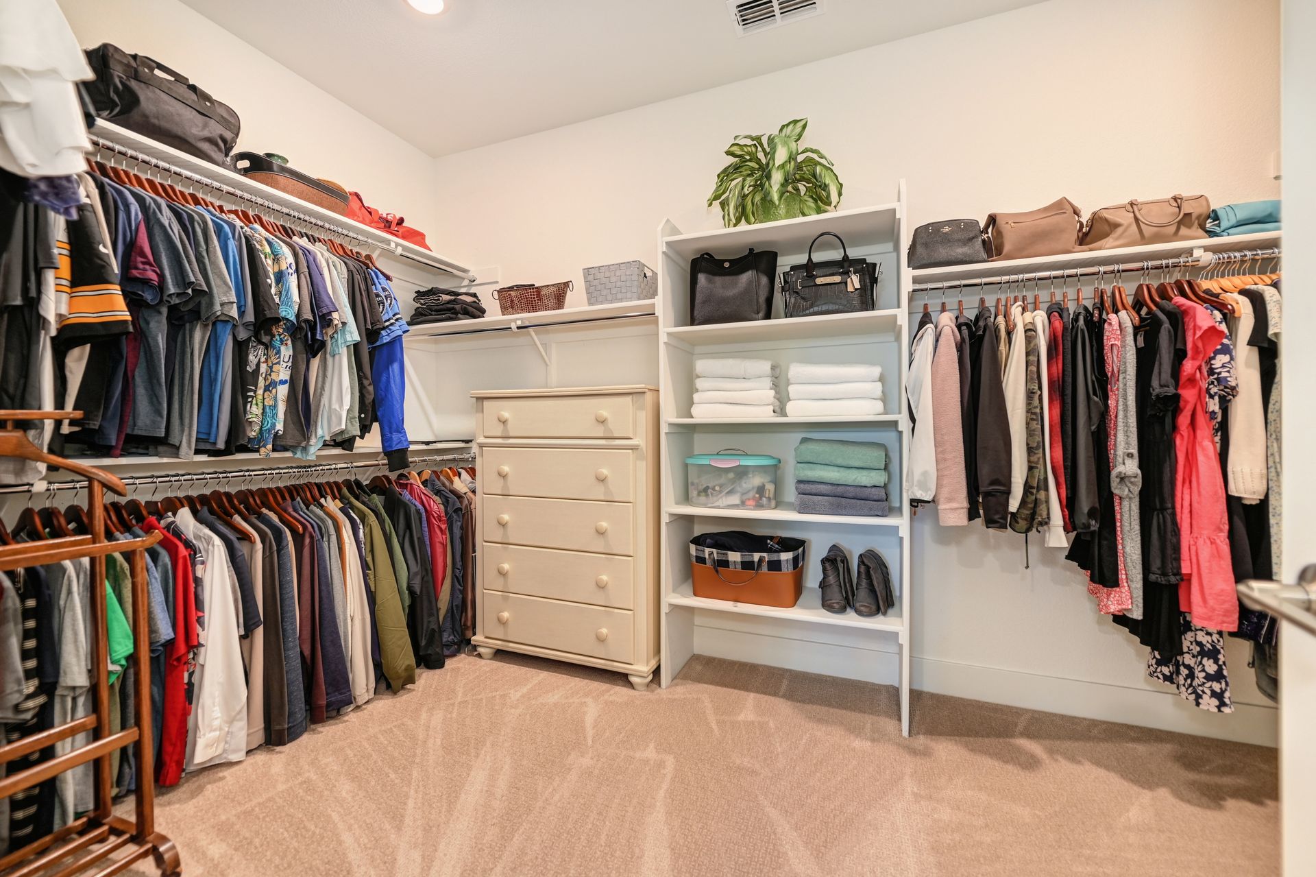 Private and spacious owner’s suite with decorative stone accent walls and a large walk-in closet with shelving.