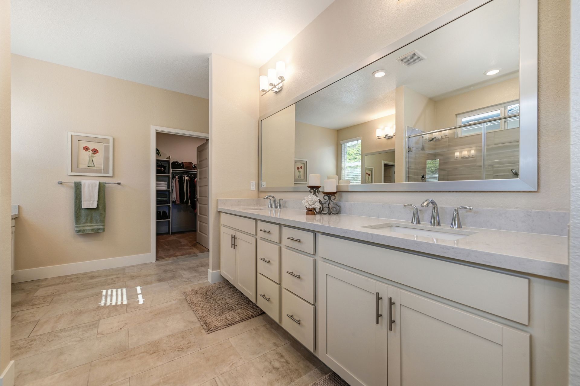 Huge spa-like primary bath with a large dual sink vanity with framed mirrors, separate makeup vanity, and a zero threshold shower with a bench and handheld showerhead.