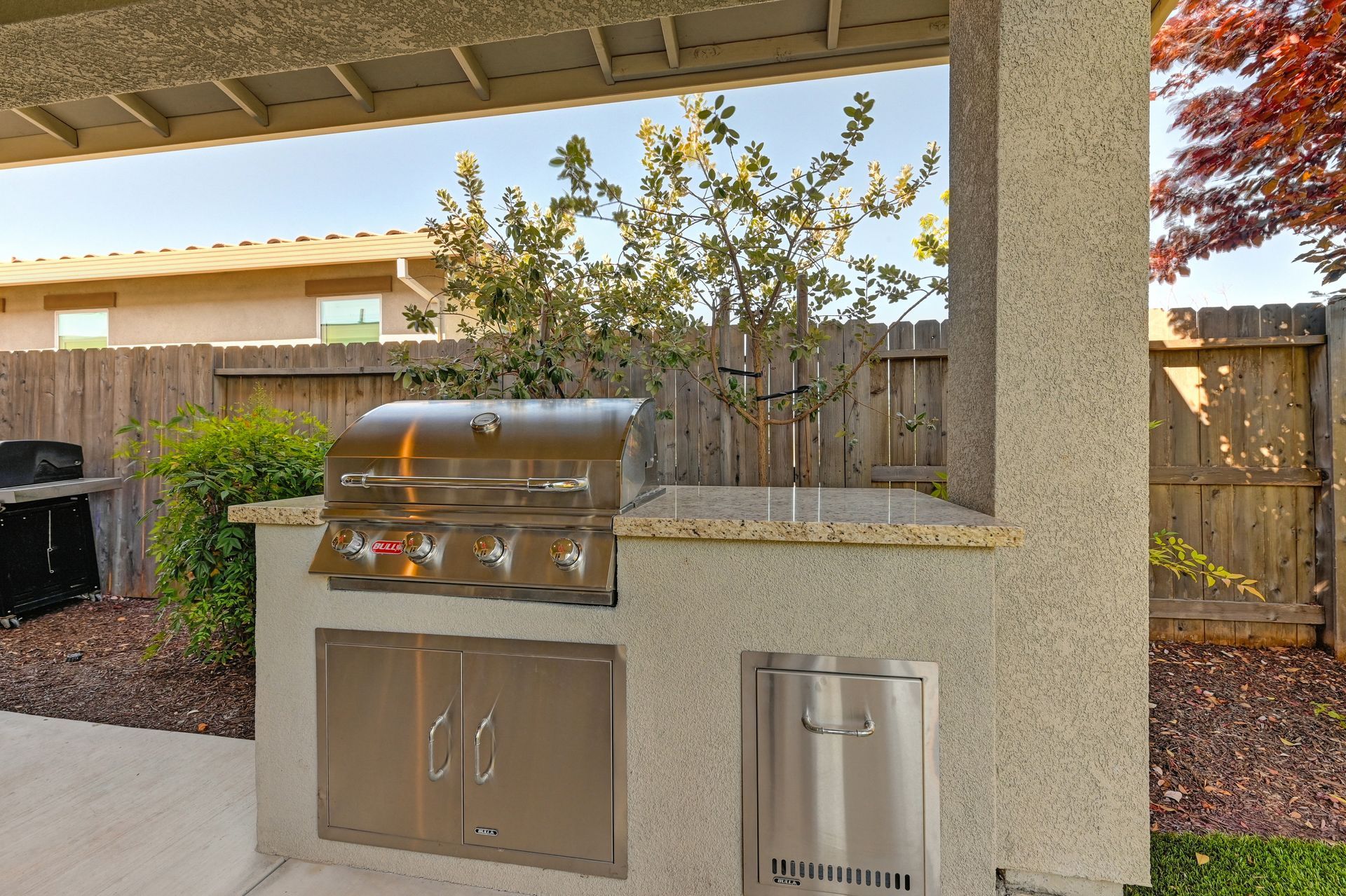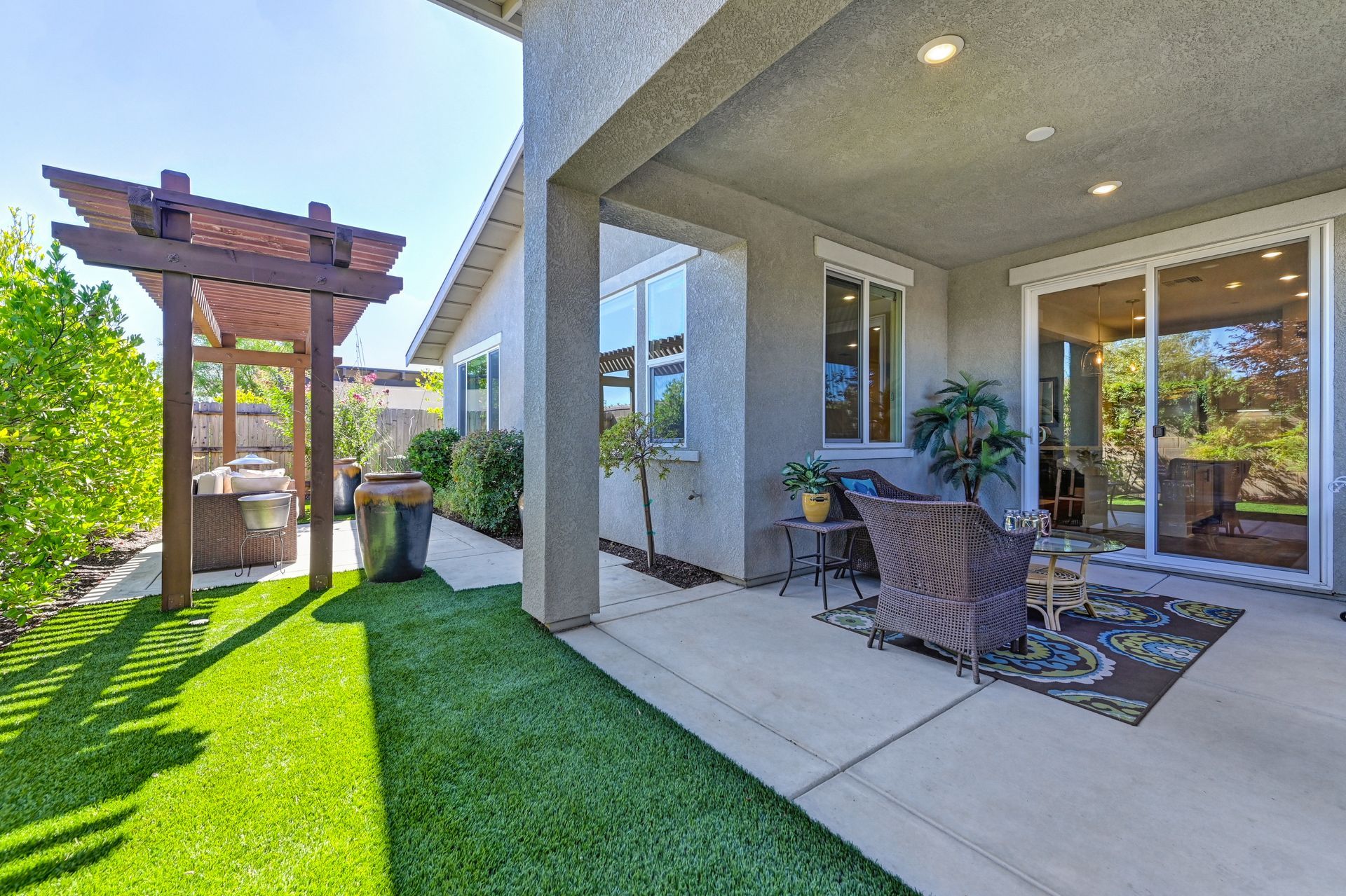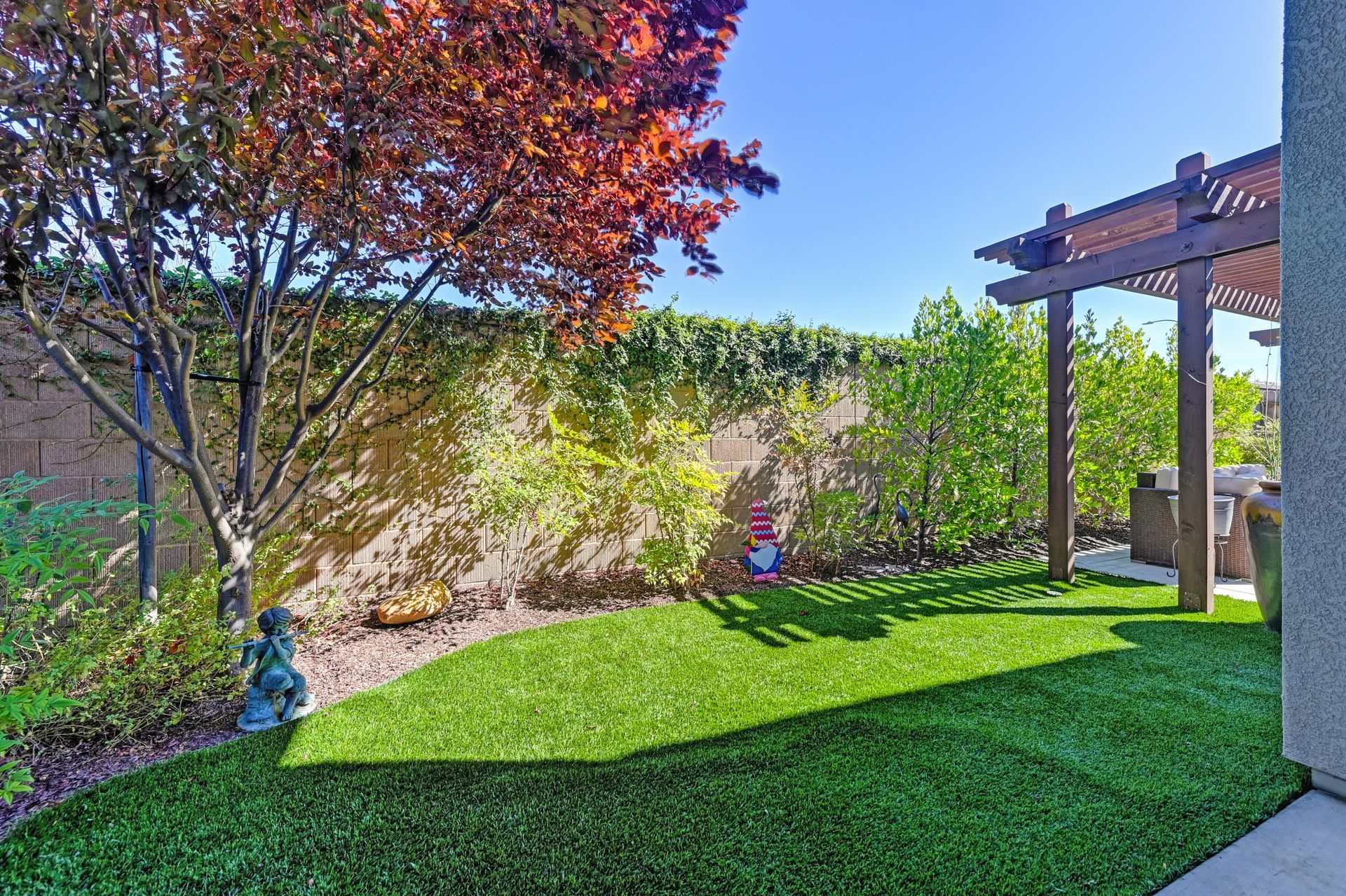Entertain in the beautifully landscaped backyard with a covered patio, built-in BBQ, artificial grass, and wooden arbor.