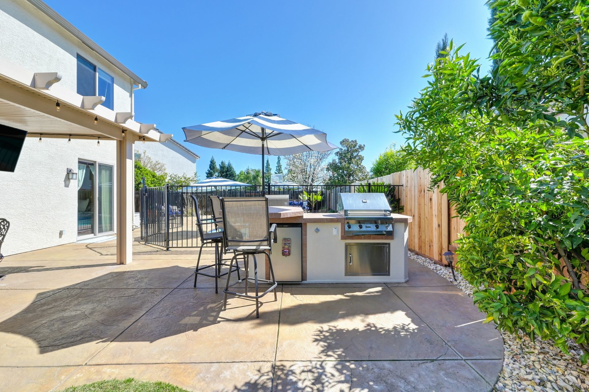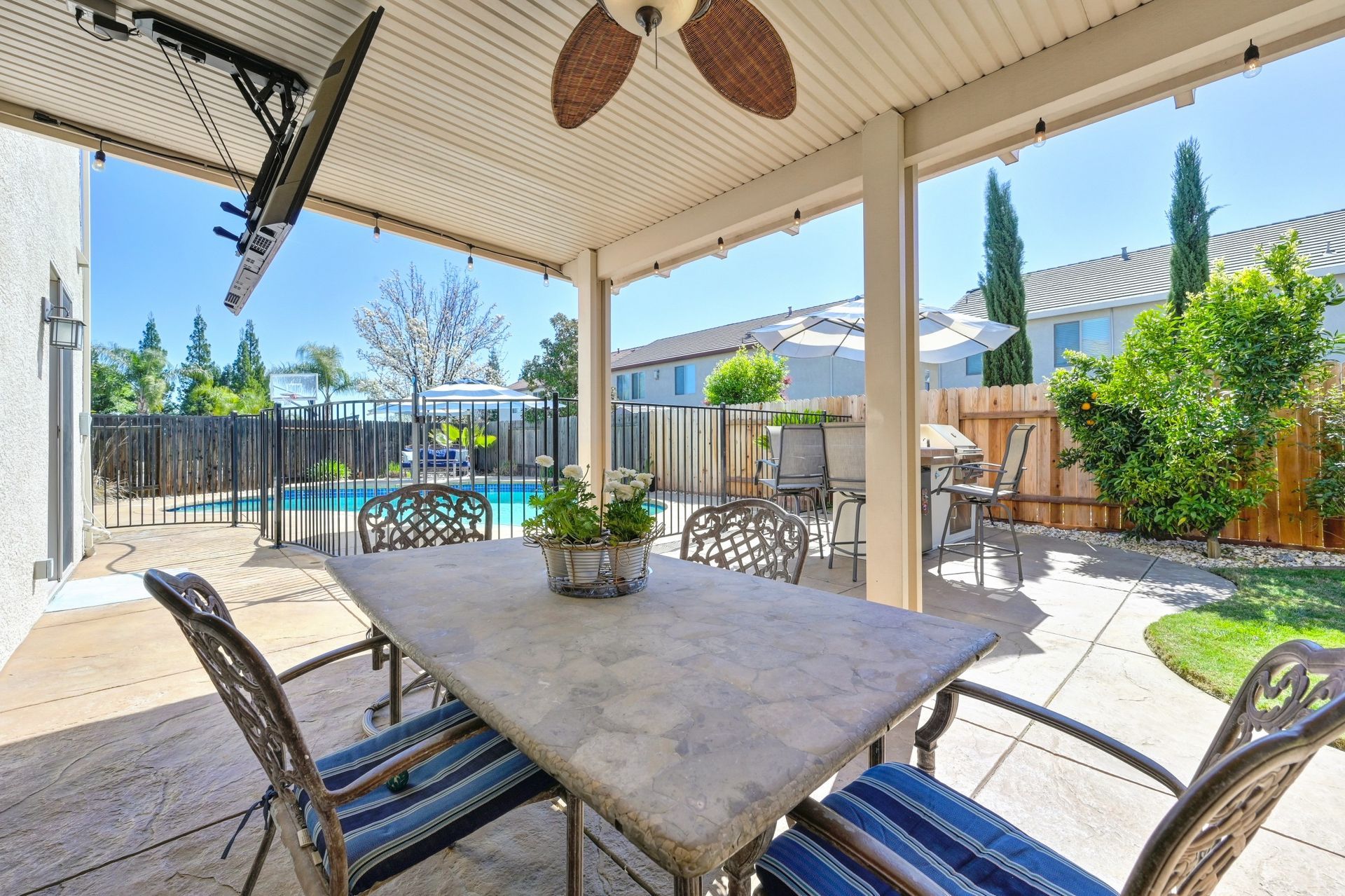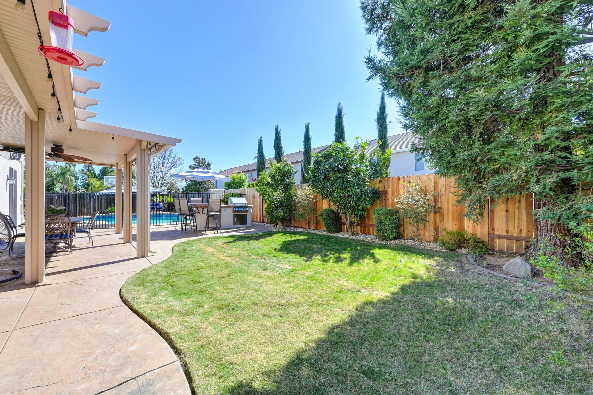 Resort style backyard with a sparkling saltwater pool with solar, a cabo shelf with an umbrella holder, and a pool fence, a covered patio with a ceiling fan and outdoor tv with remote dropdown, outdoor kitchen with a BBQ with a dedicated gas line, a refrigerator, and bar seating, stamped concrete, new fence, grass, and mature trees including a lemon and mandarin tree.
