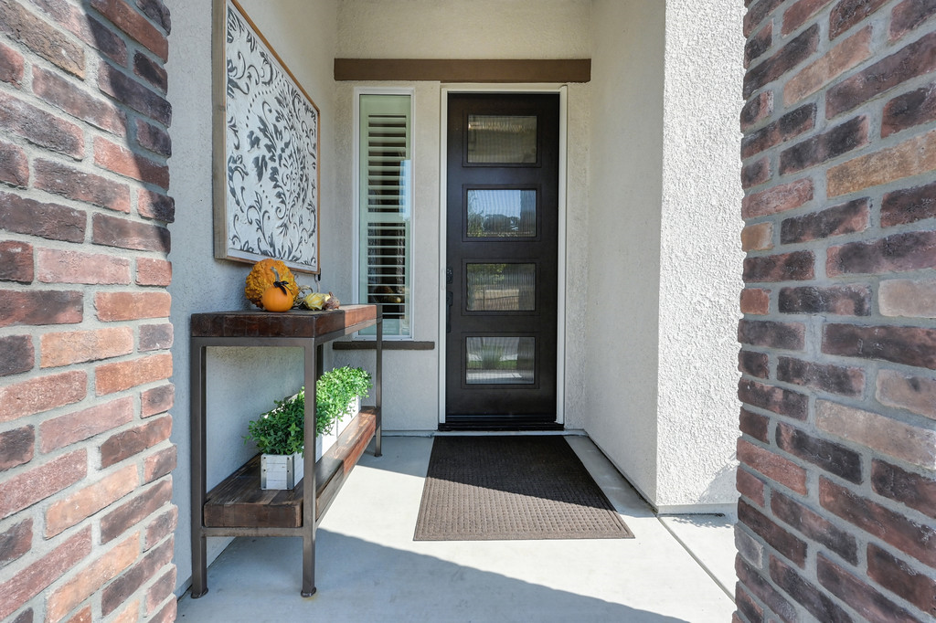 Charming curb appeal with shutters and brick detail, covered porch with updated lighting, new decorative door with windows, a phantom invisible screen door, keyless entry, Arlo camera doorbell, and HOA maintained landscaping. Upgraded and sealed 12” x 24” tile flooring, Hunter Douglas plantation shutters, recessed lighting, wide hallways, 5 ¼” baseboards, custom paint, 10’ ceilings, 6 panel Rockport doors, and modern ceiling fans throughout.