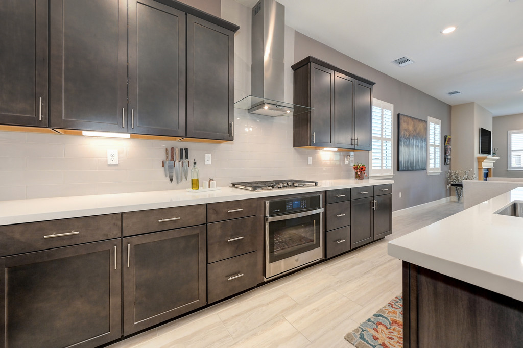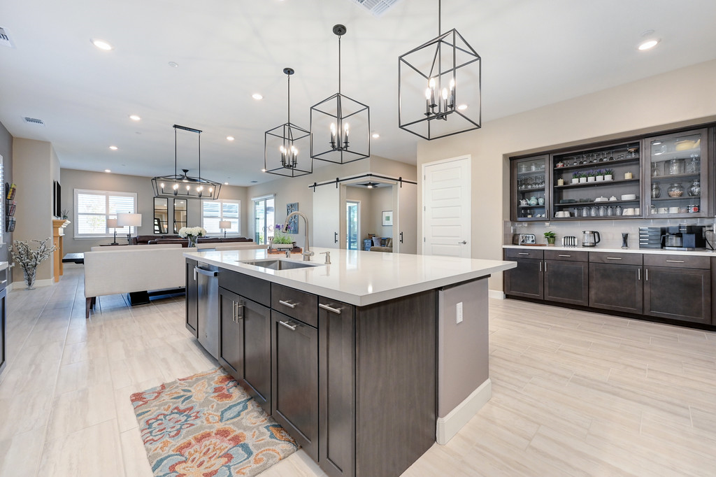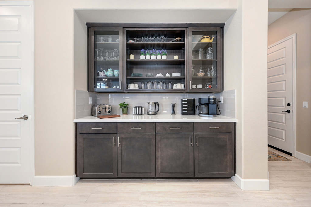 Kitchen features a huge island with counter seating, quartz countertops, Restoration Hardwood style pendant lighting, decorative tile backsplash, GE Profile stainless steel appliances (including two ovens and a built-in cooktop), rich cabinetry with pull-outs and decorative hardware, under cabinet lighting, a stainless steel hood, dreamy walk-in pantry, and a built-in buffet/cafe with upper cabinetry with glass fronts.